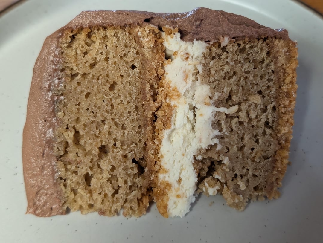 Graham cracker cake with a graham cracker crust layer, a toasted marshmallow buttercream in between, and a whipped chocolate cream cheese frosting