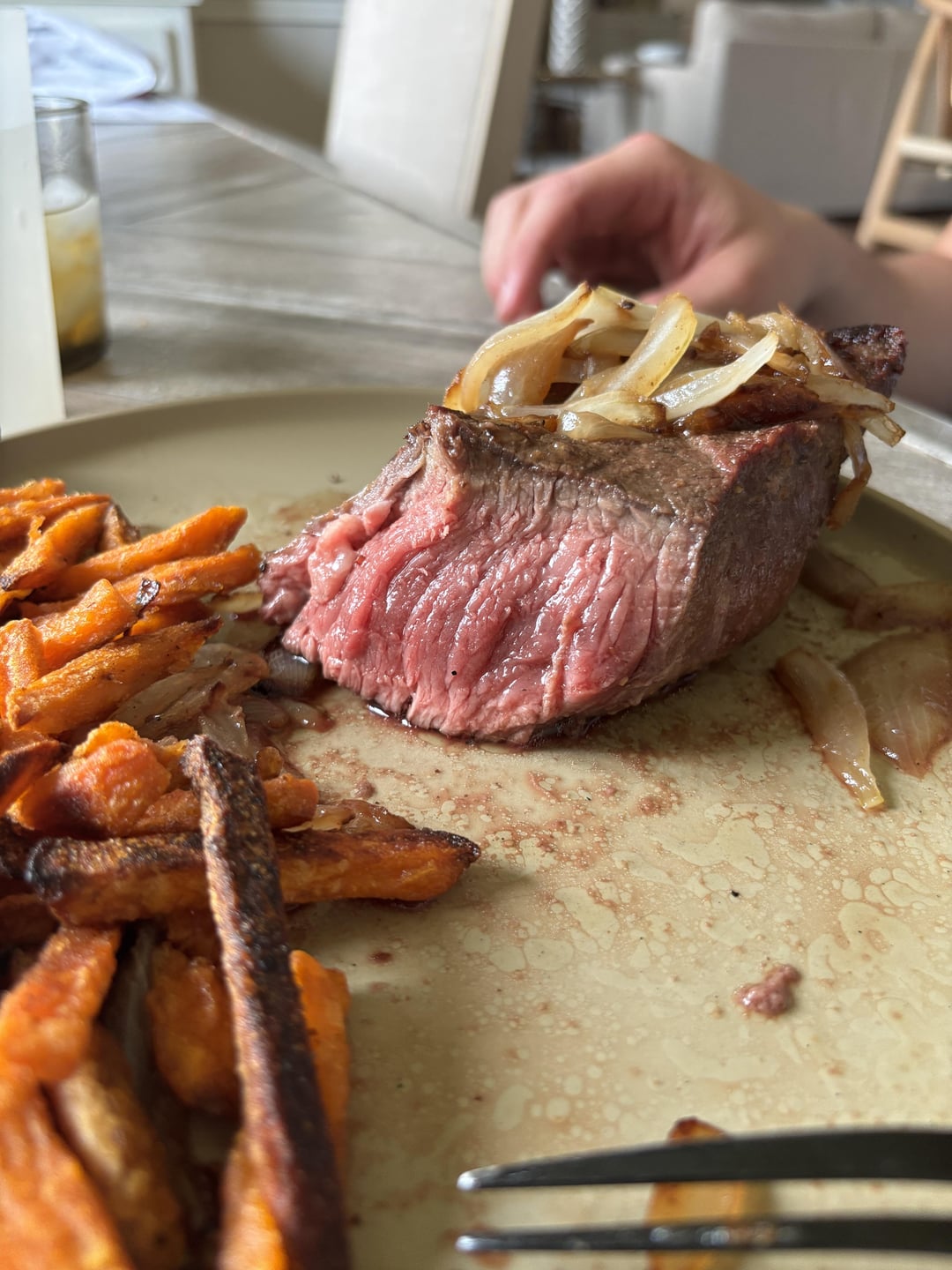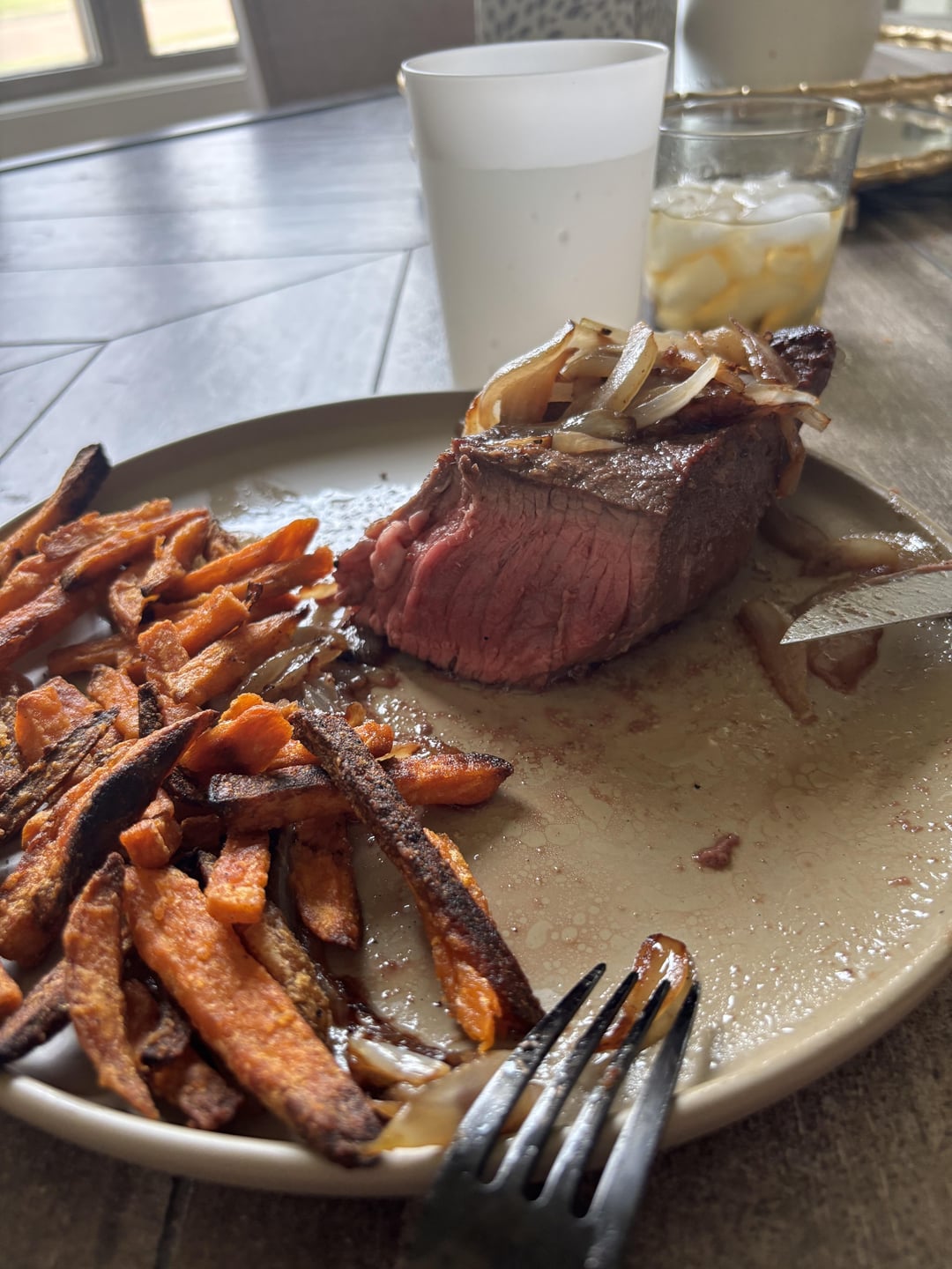 With thicker steaks especially, you gotta let them come to room temp. It was definitely cooked longer on one side, so it’s pretty uneven. The heat was probably too low, too.