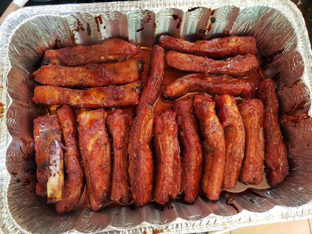 Preheat oven to 350 °F. Place ribs in a foil tray and coat with: honey, Sriracha, BBQ sauce (Sweet Baby Ray's). Sprinkle brown sugar on top and add a few pads of butter. Cover the tray with aluminum foil and place in the oven to cook for 1 hour.