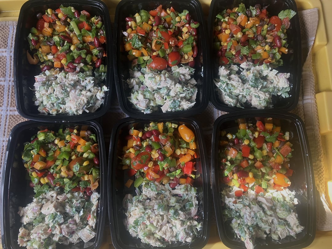 Lunch- chicken salad made with Greek yogurt, spicy dense bean salad