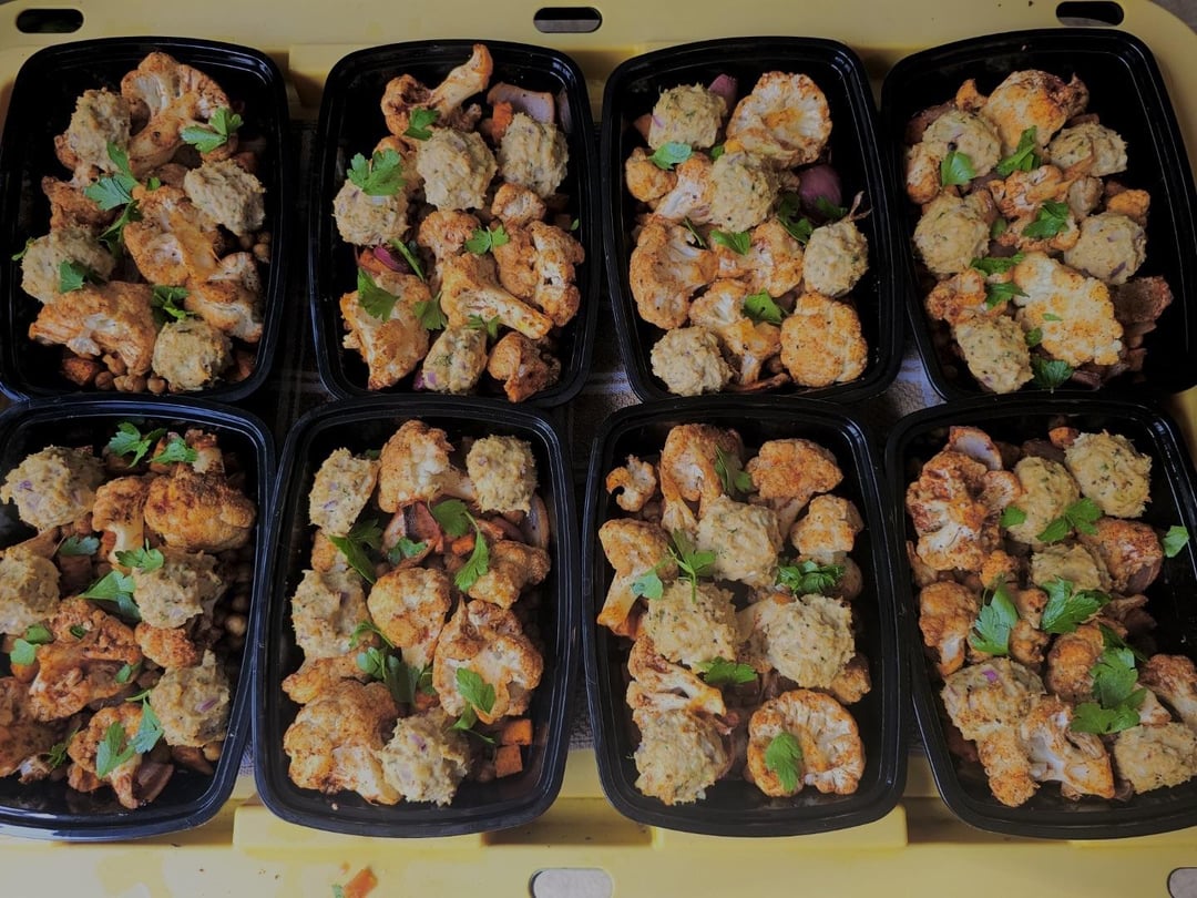 Dinner- chicken harissa meatballs with roasted sweet potatoes, chickpeas, red onion, and cauliflower (made a couple extra dinners for my boyfriend)