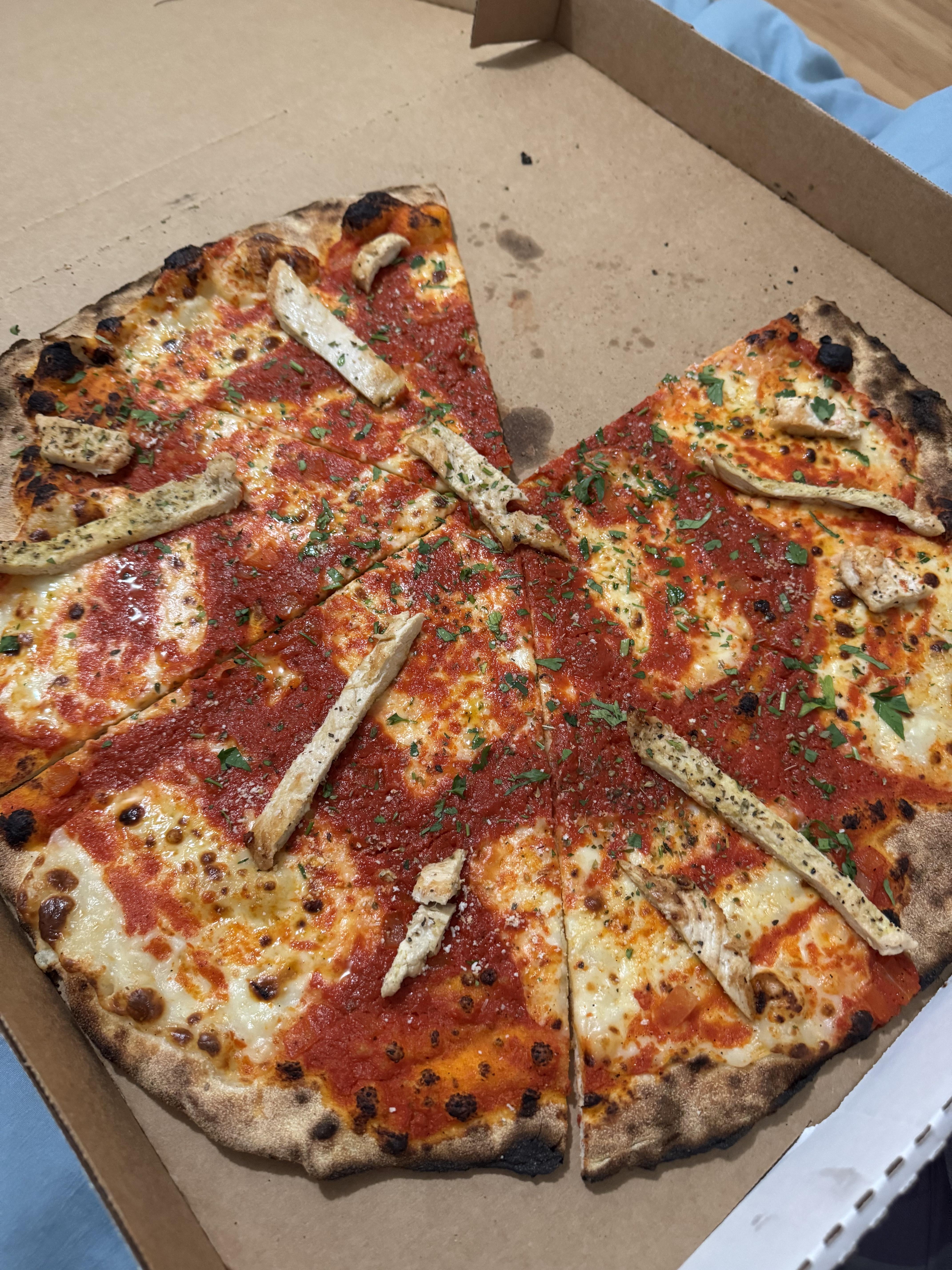 To be honest, that pie is actually fairly nice looking, minus the insane amount of seasoning. It’s not that terrible. Very Staten Island Neapolitan style. The chicken though? That’s hilarious. Also if this was NY nobody puts chicken on pizza unless you get fast food like Domino’s. However, as a customer, you asked for chicken, as weird as that is, and they clearly failed the assignment. I can’t decide whether it’s a crime or not. I mean, chicken is heavy to put on a thin crispy Staten Island Neapolitan, so they were probably like wtf do we do. Likey a customer request decision leading to the slaughter of the pie.