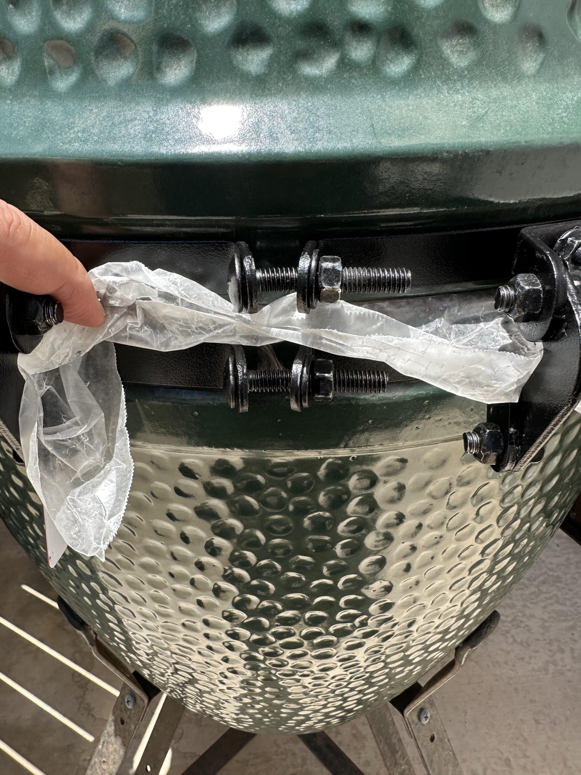Ok I have replaced the bands and hinge to the new system. I also installed a Rutland gasket. It has a slight overbite. The wax paper between the dome and base is a little loose in the front. Hopefully that does not mean I have air coming in when I cook.