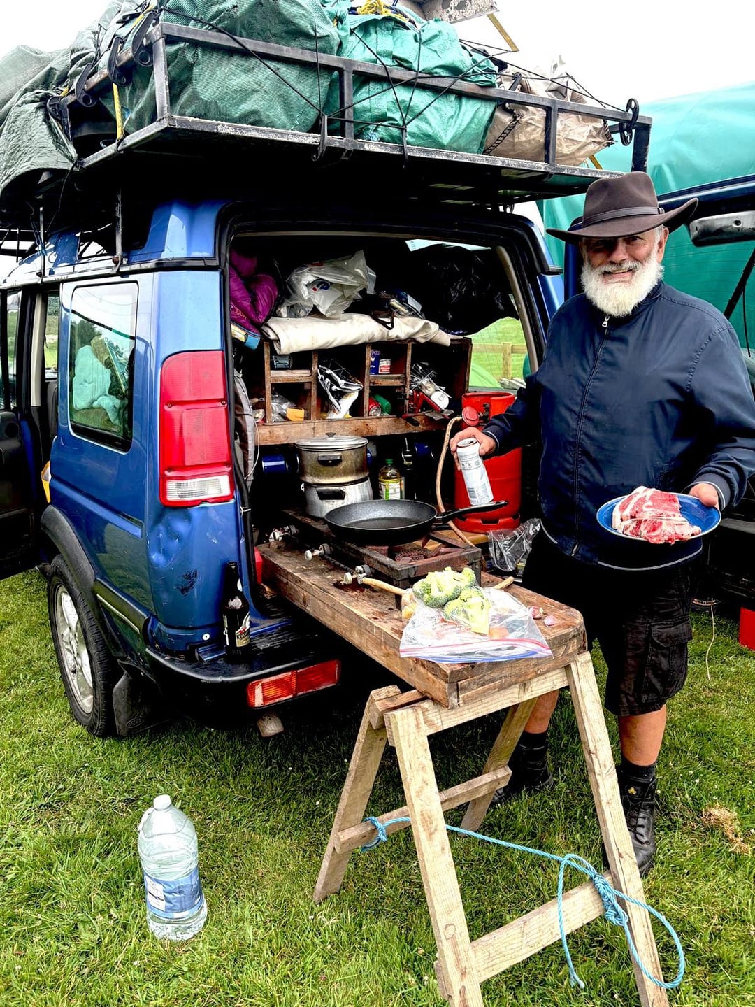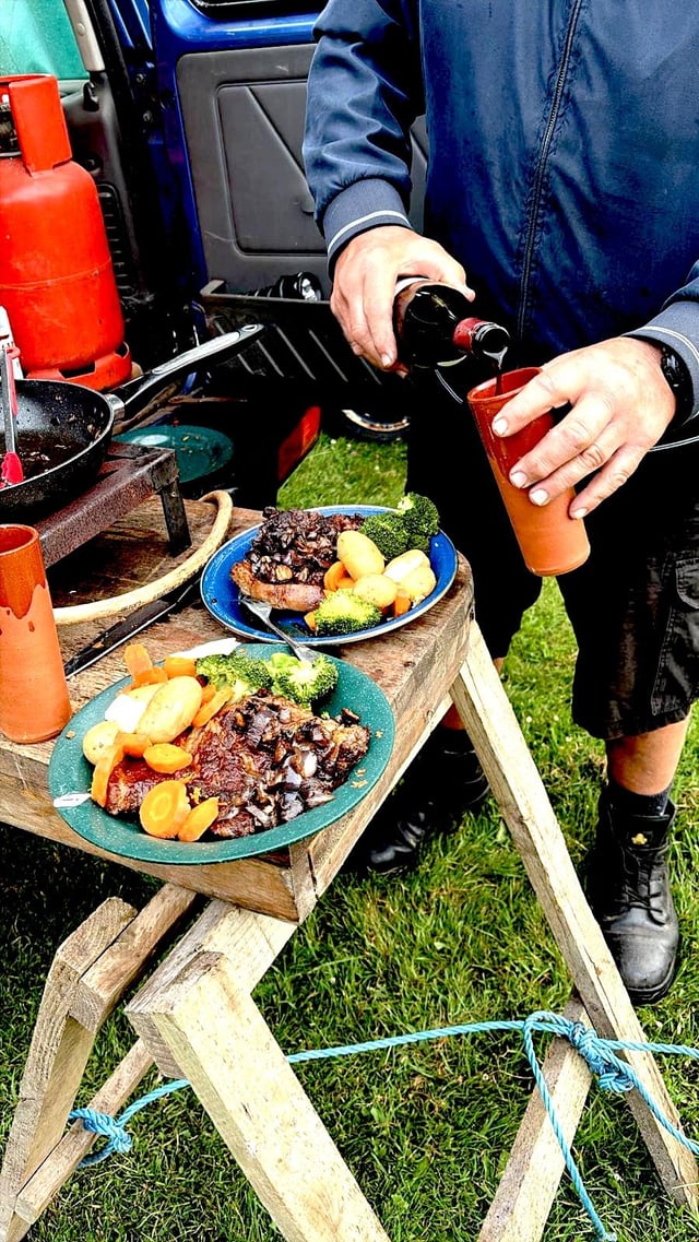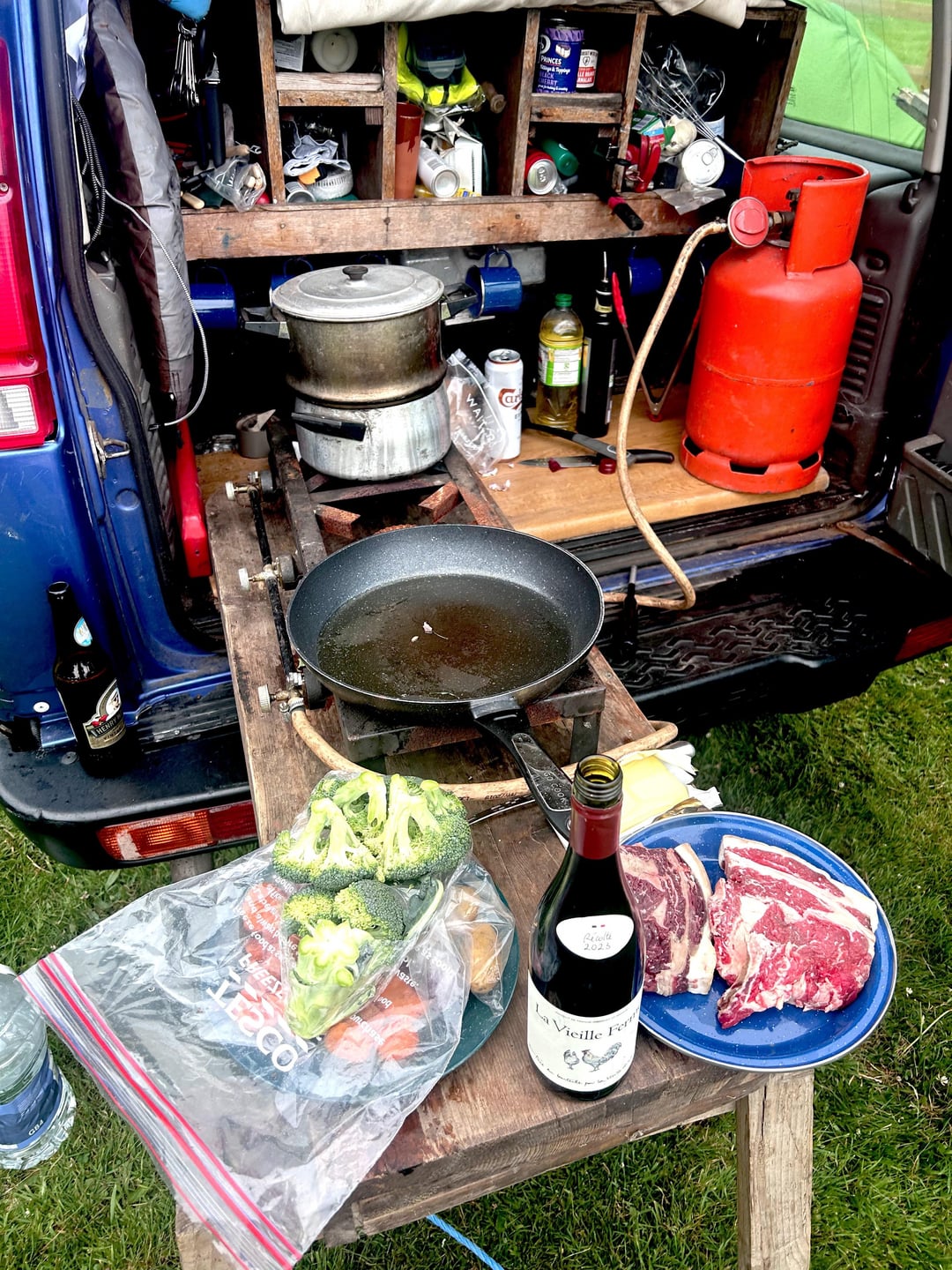 Enjoying a lovely evening steak dinner outdoors. Cooked in the back of the Landrover.