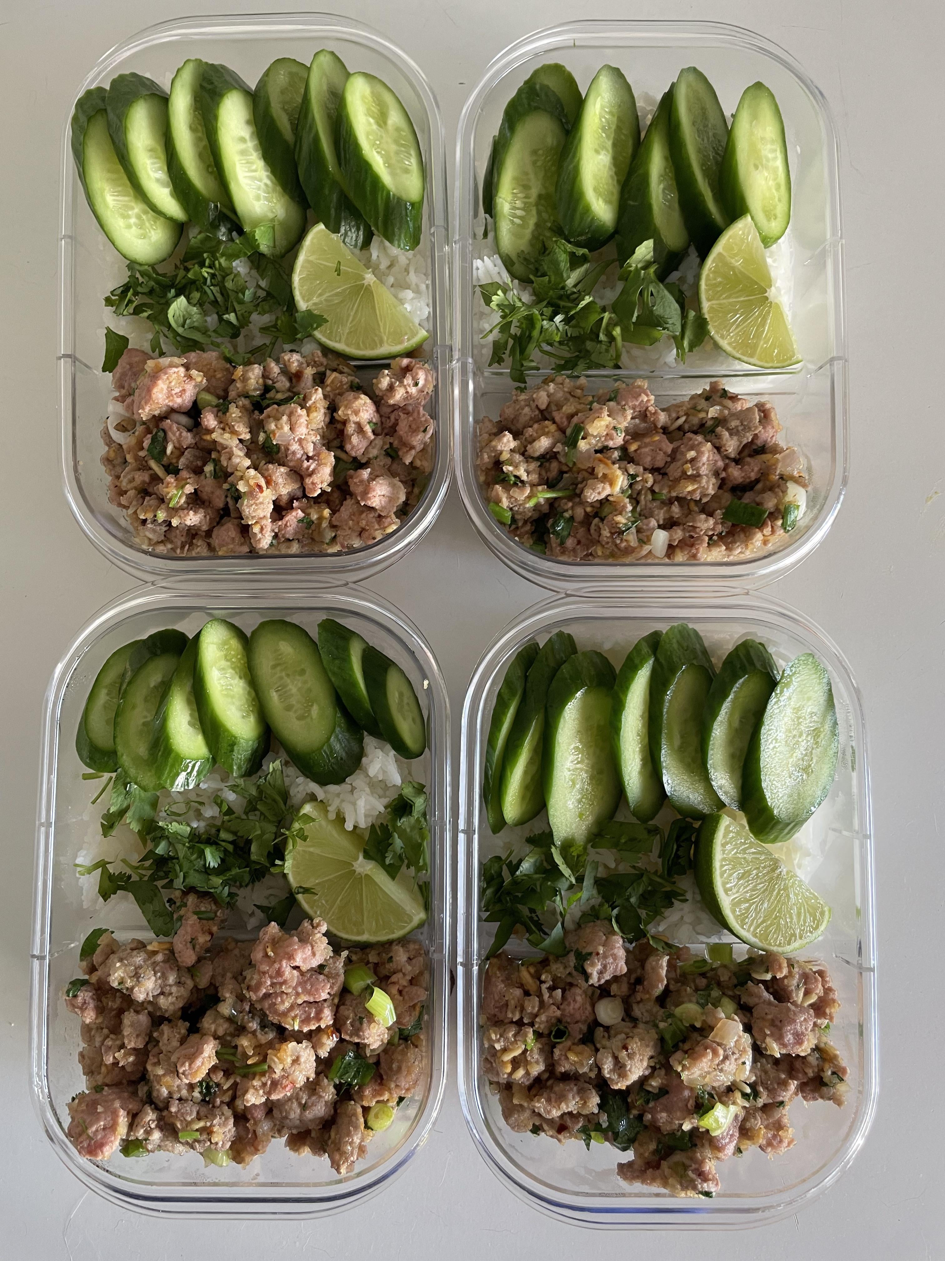 this is a really flavorful and easy meal prep. 2 lbs of ground pork, 5tbsp rice that has been toasted in a pan and then ground up in a mortar pestle, 2 or 3 decent sized shallots, 7tbsp fish sauce, juice of 4 limes, chili flakes, 1 bunch chopped mint, 1 bunch chopped cilantro, 4 green onions sliced. brown the meat and add the shallots. let it cook for a few minutes and then add the ground up rice, fish sauce, lime juice, and chili flakes, and a splash of water. cook that and let it reduce a bit (wet but not watery). remove from heat and stir in the herbs. adjust the ratios of ingredients if you like, this is a flexible dish. served w rice, sliced cucumber, and lime