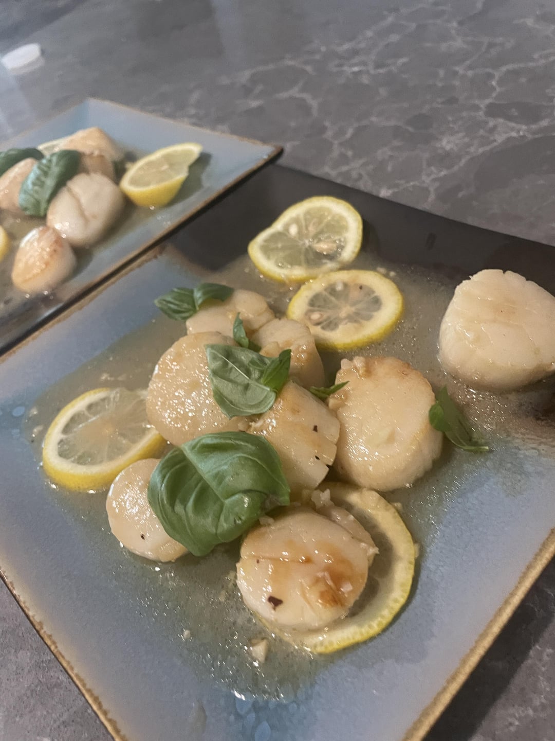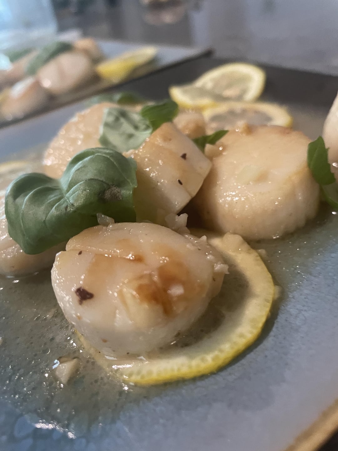 Plate the lemons if you haven't already then plate the scallops and garnish with fresh basil.
