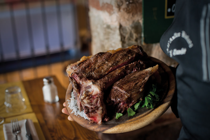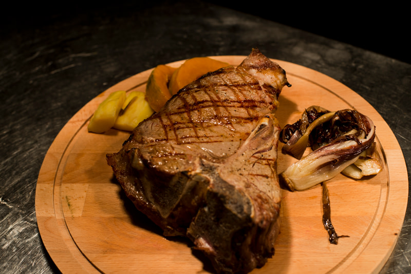 The steak is served with leaves of lettuce and lemon in dishes of a style between Vietri and majolica, already cut and always as a fillet to respect the tradition of Fiorentina. The breed can vary, giving preference to meats that tend to be soft and can be cut almost with just a fork.
