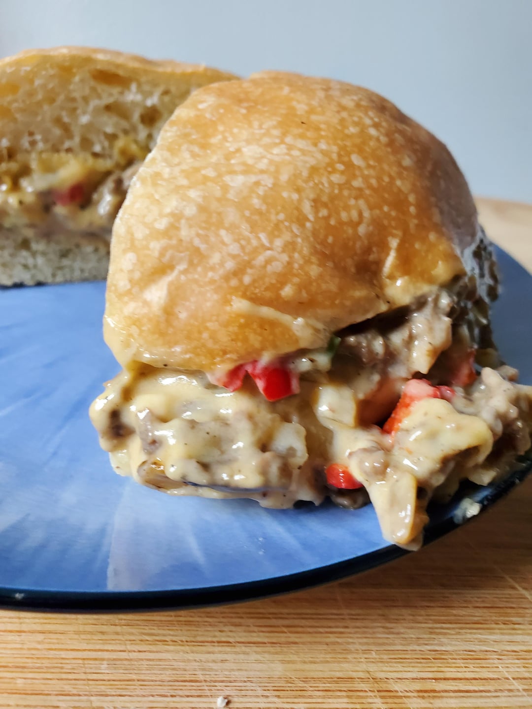 Had enough sliced ribeye left to make a small version of chopped cheesesteak with onions, sweet peppers, and jalapeños on a soft roll.