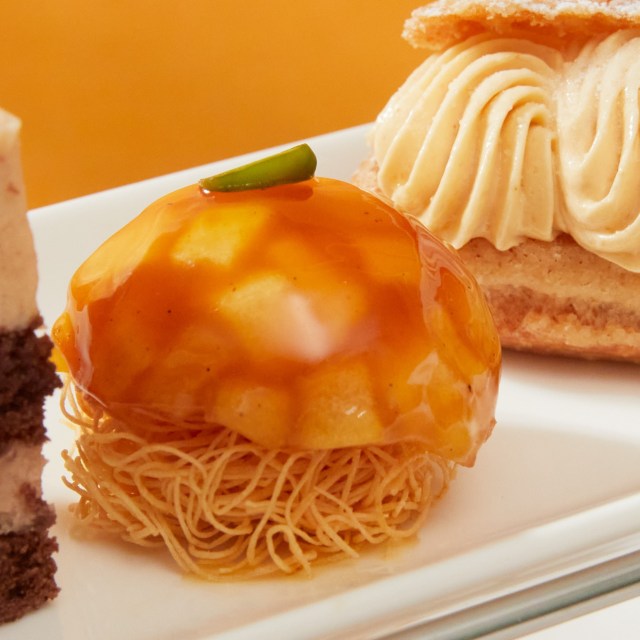 This Italian twist on a traditional afternoon tea includes bite-sized cakes and baked goods with autumnal flavours, three of which are totally new. The “Mele“, for example, is one new delight that catches the eye with its apple-like topping, made from caramelised jelly, that sits atop a delicate, noodle-like pastry made with finely shredded phyllo dough known as kadaif.