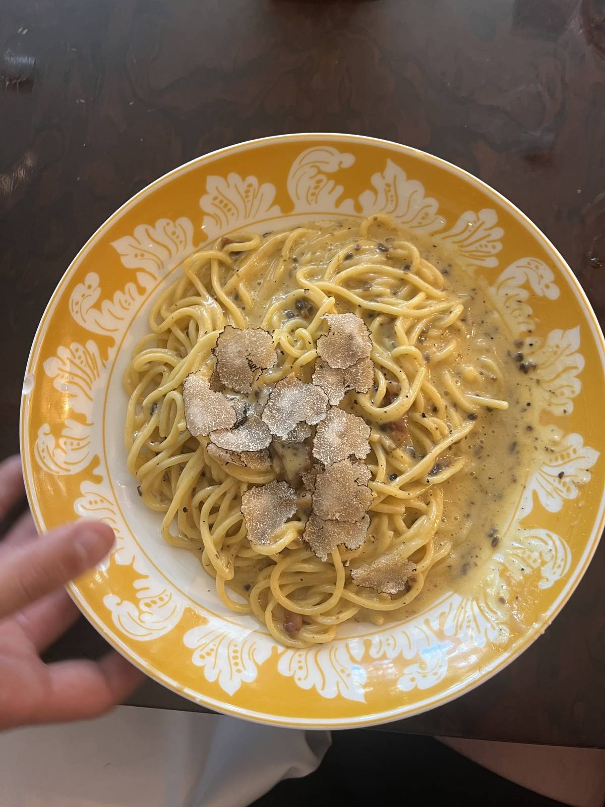 For the same reason, truffle everywhere: to crown a carbonara pasta topped inside a wheel of pecorino at the table or to brush a well-cooked sirloin steak rossini. Strong flavors in keeping with the power of the place. The aim is to leave an impression on the eyes and also on the palate of the diner.