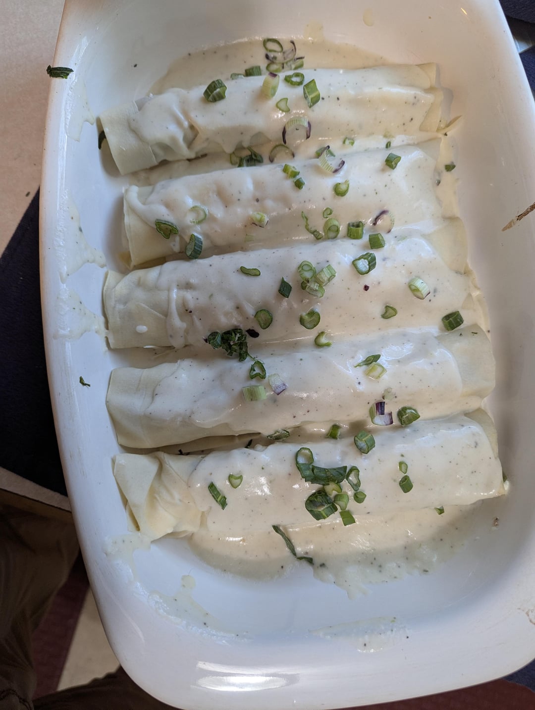 I rolled out a sheet of pasta, cut into 5 rectangles, and rolled them up like burritos filled with chicken, bacon, spinach, feta, garlic, and pecorino. Topped with an Alfredo sauce and baked.