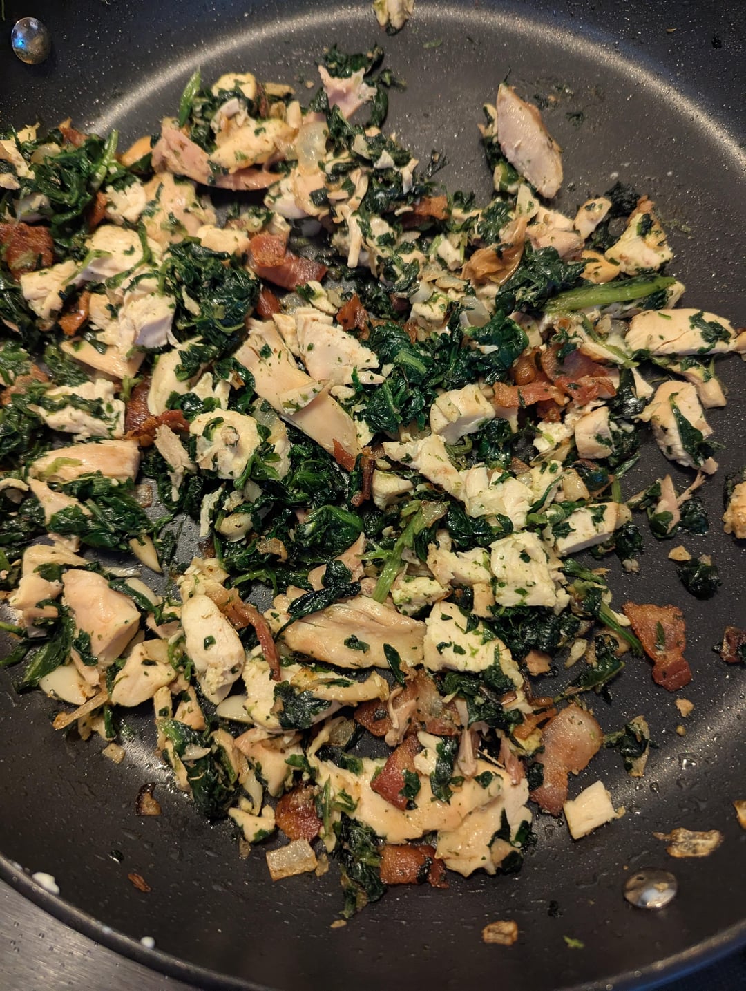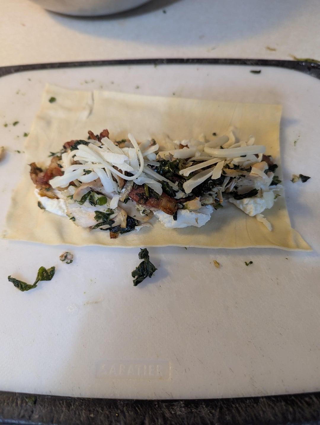 No recipe, just wanted something a little different. 4 strips bacon cooked, then sauteed 4 large cloves of garlic for 30 sec before adding rotisserie chicken and 1/2 cup frozen spinach. I had extra frozen pasta, and rolled out a little for the casings.