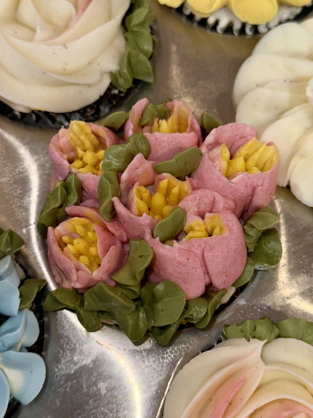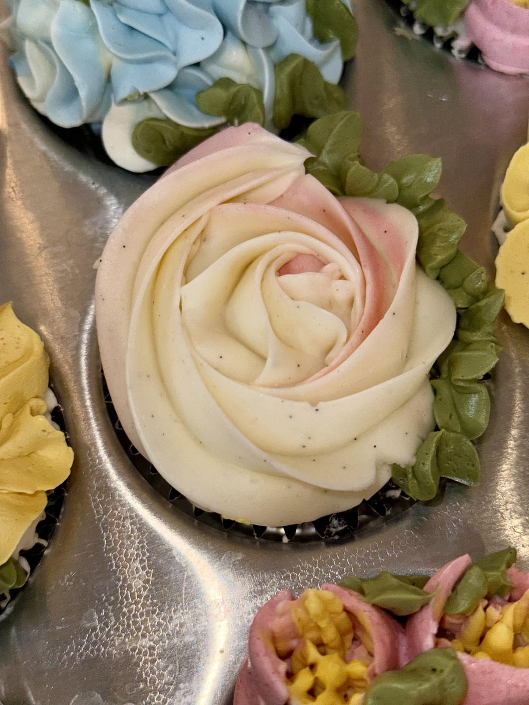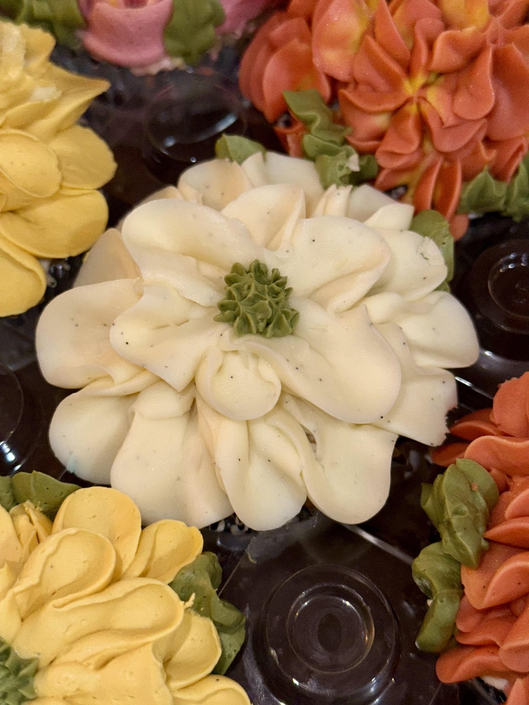 I see the vanilla specks in the frosting and I think it is a nice touch. It makes them feel extra fancy. I would like to know how you made the flowers with the yellow stamen in the middle. Very good detail.