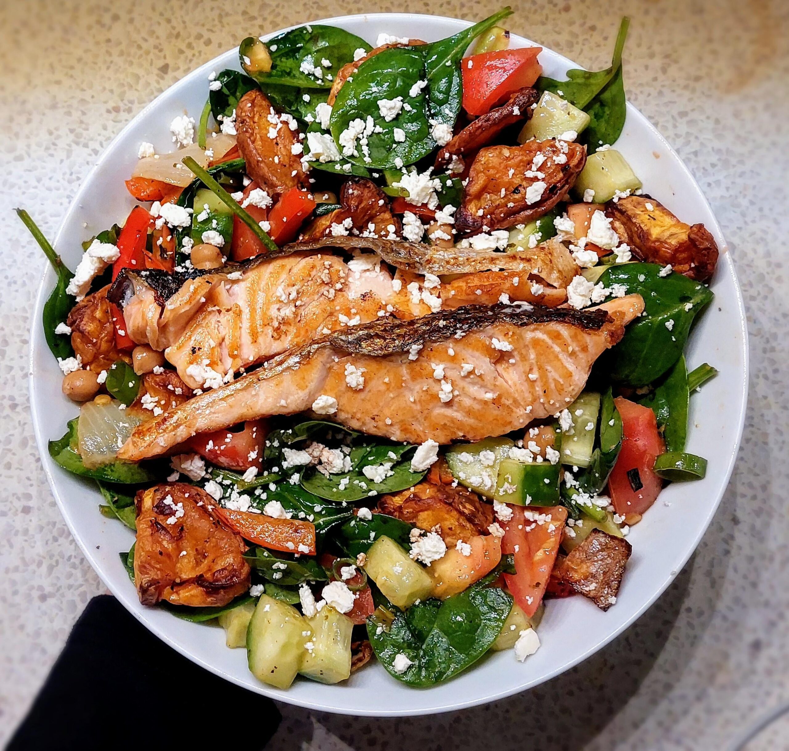 A staple of mine: Crispy skin salmon, baby spinach, roast sweet potato and onion, chickpeas, sauteed capsicum and tomato, diced cucumber, feta, spring onion, olive oil, balsamic vinegar. by Economy_Rain8349 Write A CommentYou must be logged in to post a comment.