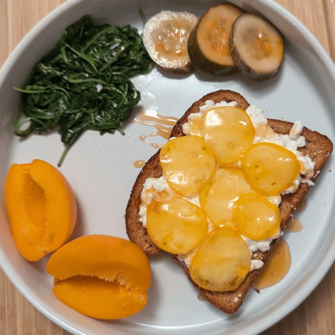 Whole wheat cottage cheese toast with homegrown yellow tomatoes, sauteed arugula with olive oil and lemon, apricot, and kimchi pickles (trying to do probiotics with every meal!)