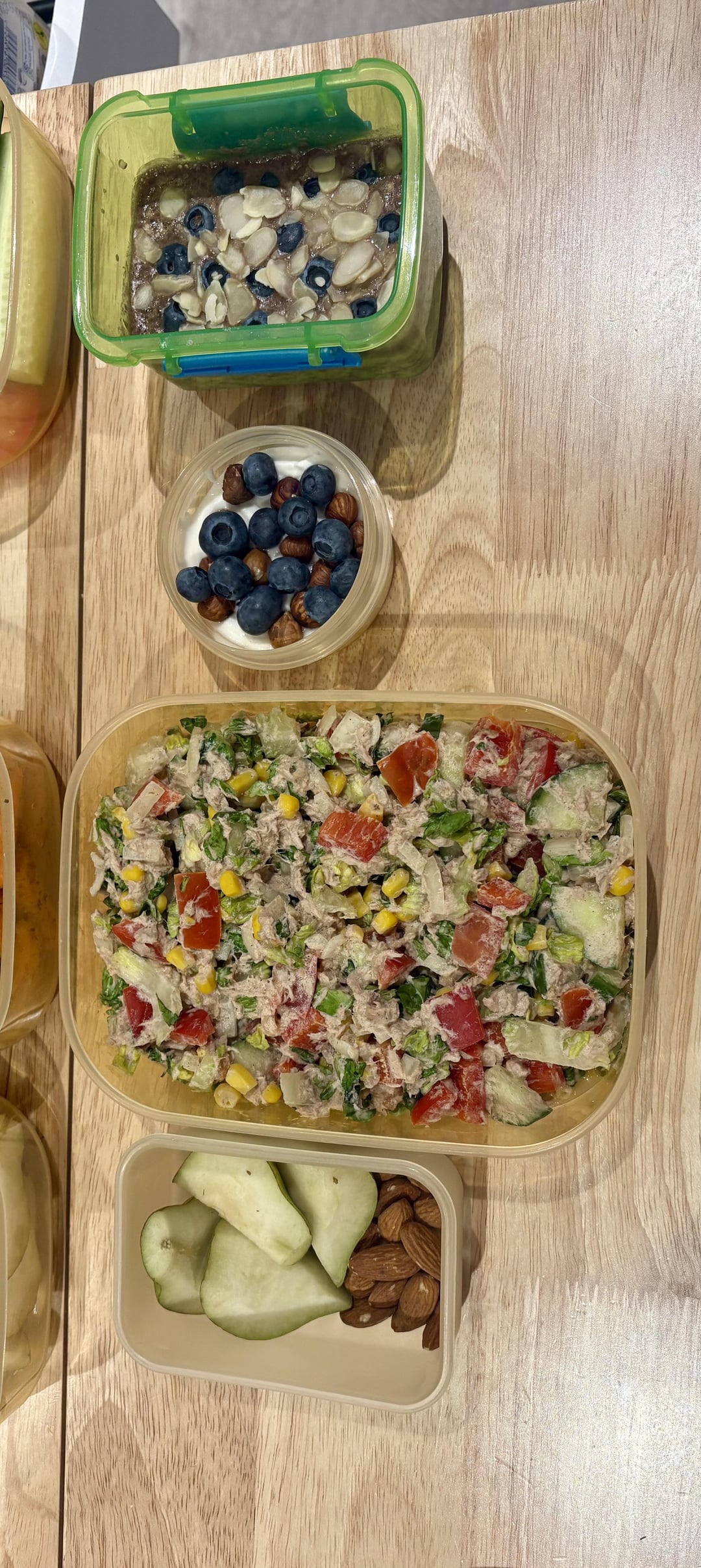 lunch: tuna salad (tuna, iceberg lettuce, tomatoes, cucumber, onion, red pepper, sweetcorn and greek yoghurt)