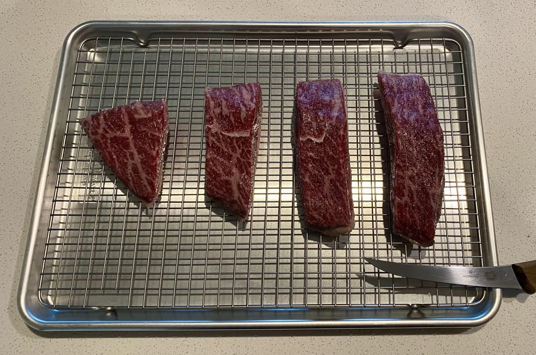 God, these are beautiful cuts; good color, no dye. They have the marbling of a nice waygu, and the fat strip reminds me of pork belly. Where did you get these?