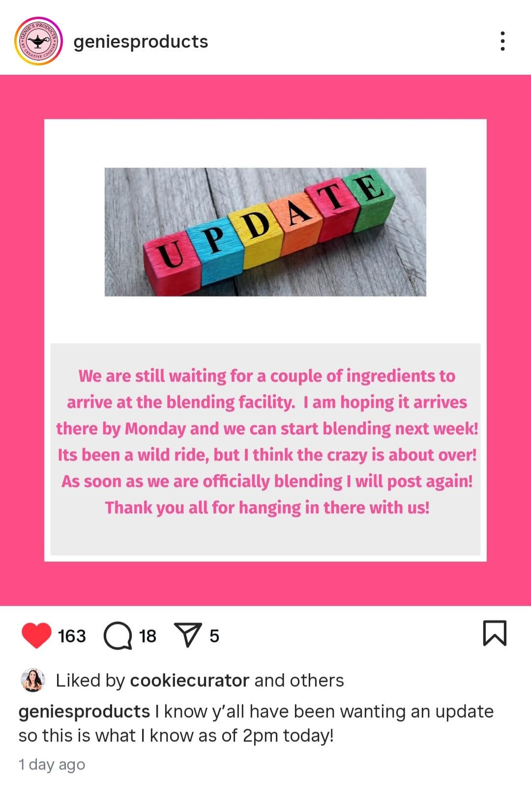 Update on Genie’s Dream meringue powder production; hopefully they’ll be back to normal in the next couple weeks!