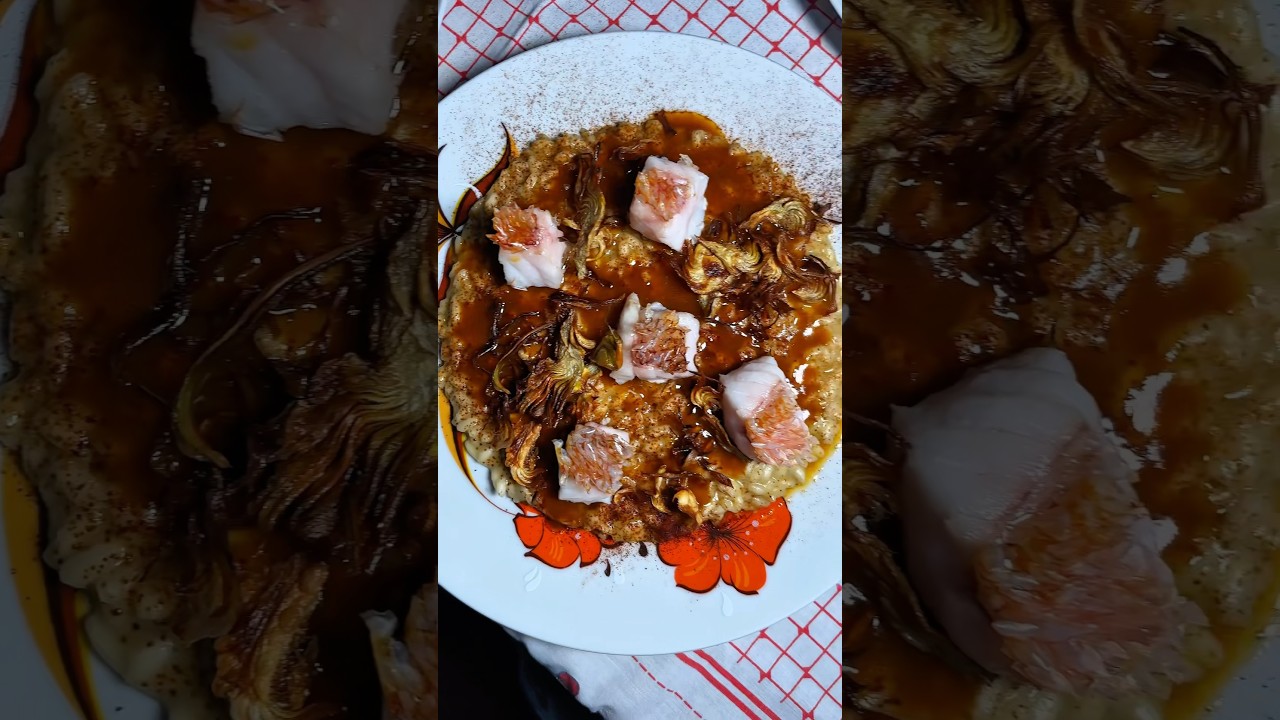 polvere di pomodori secchi riduzione di scorfano scorfano e carciofi fritti Mi scotto tutti gli scarti ovviamente senza l’enteriora E adesso lo lascio ridurre [Musica] questa Guarda cosa fa il tuo cuoco preferito Questo arriva da qua E adesso faccio una riduzione Con questi mi faccio una crema Frigoco i carciofi Mi tosto il riso Verso fine cottura vado a mettere l’acqua dei carciofi Spengo e mante col burro e l’erbe Sai che c’è da oggi mangio a casa