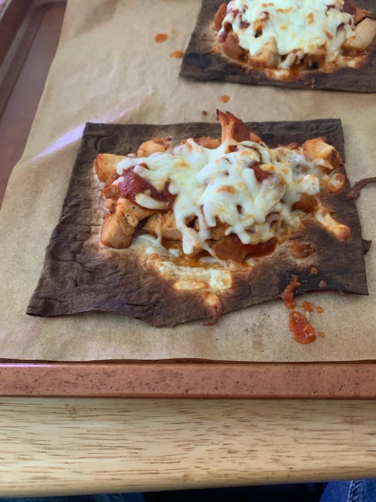 to be fair he did say it's a little over done, but he does like it when the crust is "like a cracker". I told him this isn't pizza, it's chicken parmesan on a flatbread cracker.