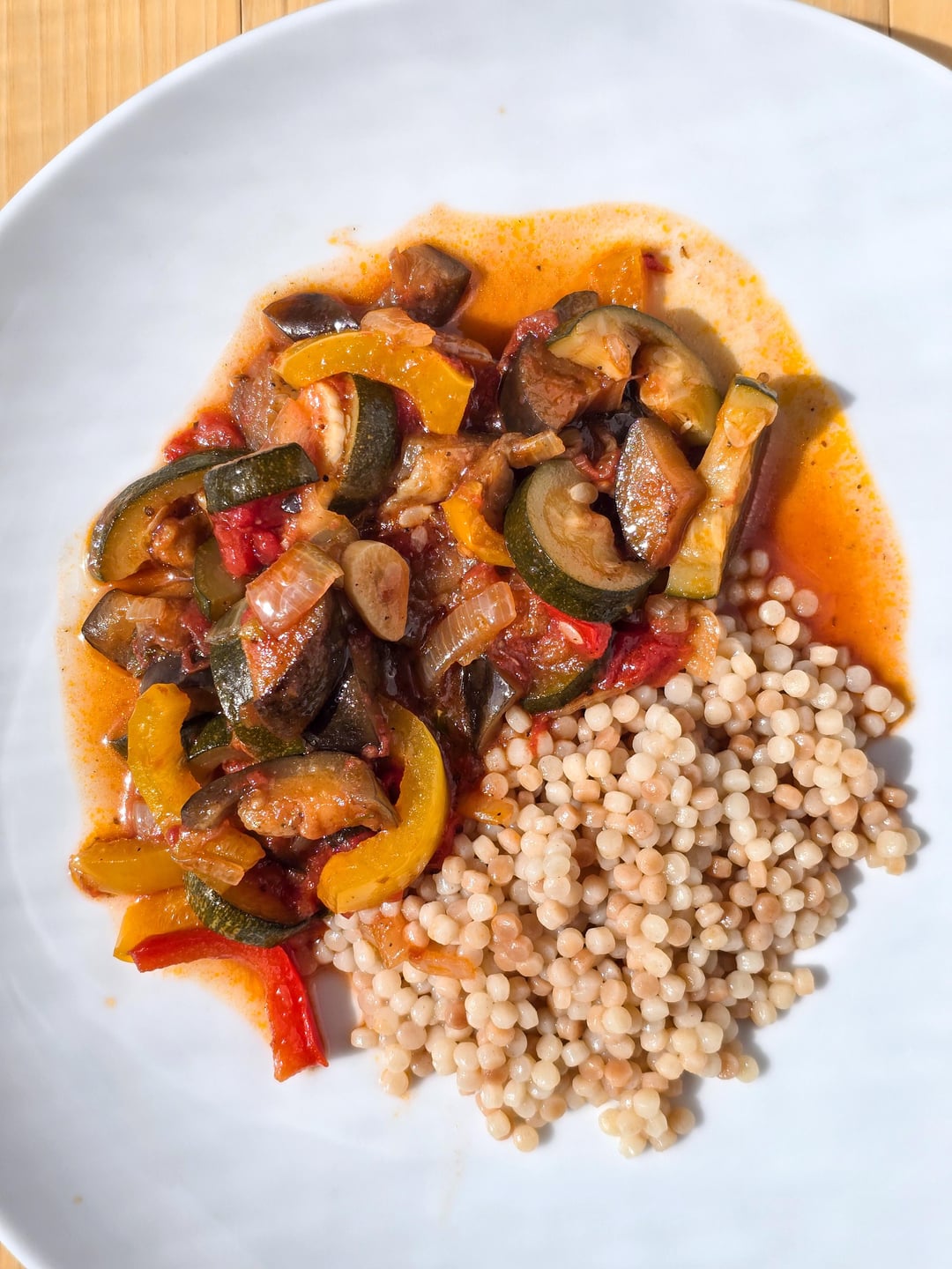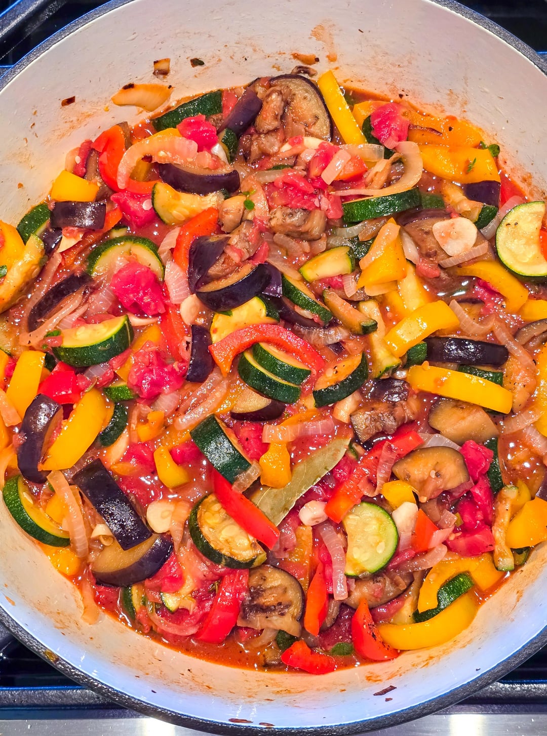 I sauté the vegetables first in olive oil: onions, garlic, eggplant, zucchini, bell peppers. Then slow-cook them with tomatoes and a bouquet of herbs. It’s a labor of love, but oh so worth it, and even more flavorful the next day.