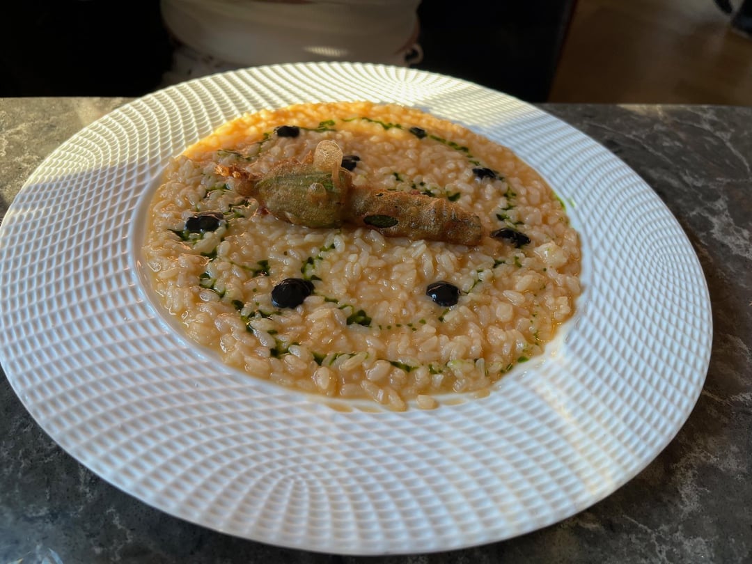 9) Main course: Koshikari rice w/ uni, squid ink aioli, zucchini blossom. Briny, creamy, a very tasty. Solid.