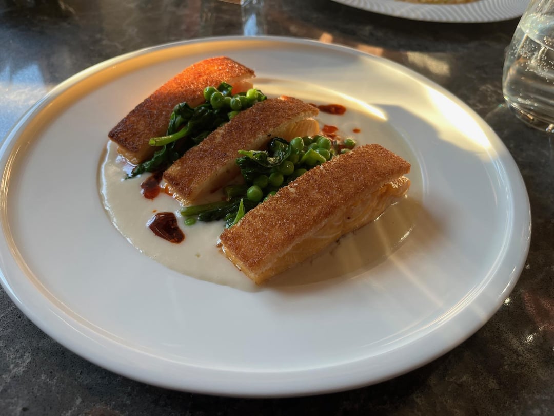 8) Main course: Ontario trout w/ brioche crust, soubise, English peas, salsa macha. Texturally clever with the brioche crust. While I enjoyed it, it was probably the weakest of the four mains ordered.