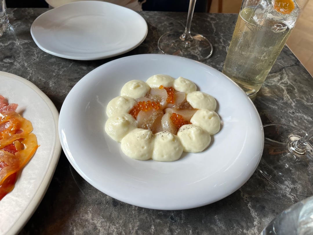 4) Appetizer: Hokkaido scallop s/ brown butter, shoyu, new potato, marigold, trout roe. Holy cow, this was good. The potato foam was buttery and delicious and it added so much to the sweet scallop.
