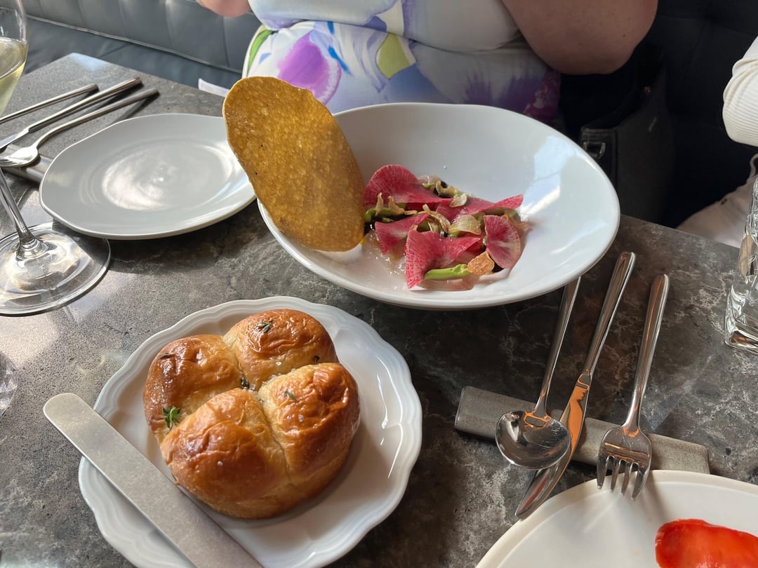 5) Two appetizers: Kampachi tostada w/ salsa negra, pickled strawberry, herbs, garlic chips, radish. Pain au lait w/ St Brigide's butter & agave. I liked the kampachi by itself but if honest the tostada had too strong a flavour and blew away the delicateness of the kampachi. It was perhaps too mild. The pain au lait was excellent.