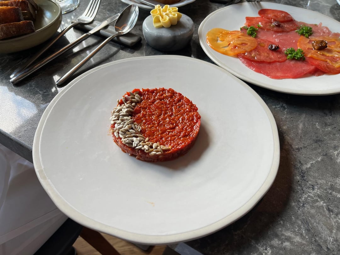 2) Appetizer: Beef tartare w/ red pepper conserva, kosho bagna cauda, sunflower seeds served with sourdough.