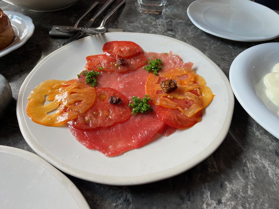 3) Appetizer: Blue-fin tuna carpaccio w/ heirloom tomatos, umami mayo, black truffle. Delicate flavour with beautiful punch from the tomotoes.