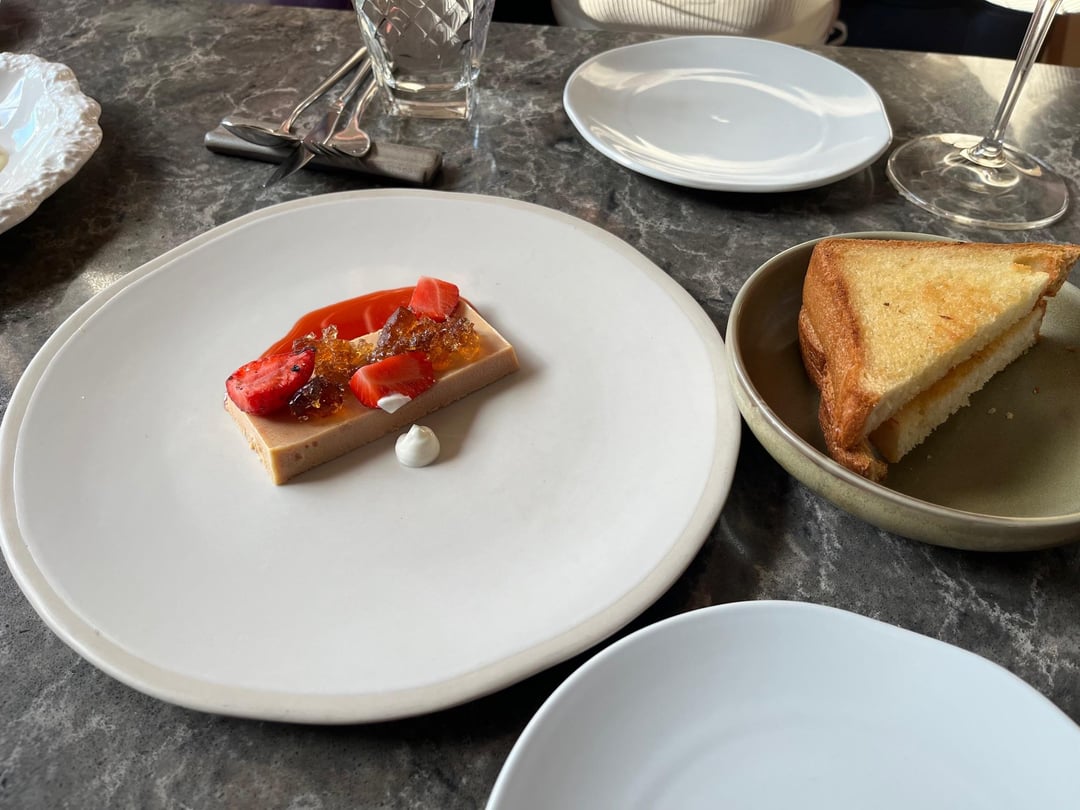 7) Mid-course: Foie gras terrine w/ bbq strawberries, guajillo, creme fraiche, madeira served with brioche. Very nice foie gras terrine.