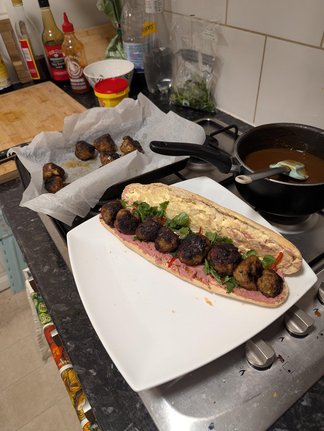 My pork belly one is better but yeah have a go. Vietnamese style pork meatballs, chicken liver pâté, pickled daikon and carrot, coriander and fresh chilli, Kewpie mayo. Fresh cooked baguette.