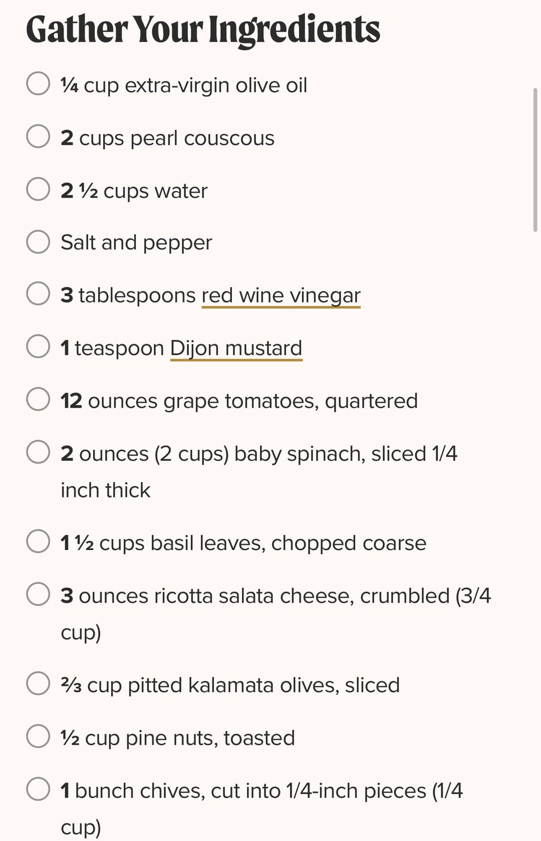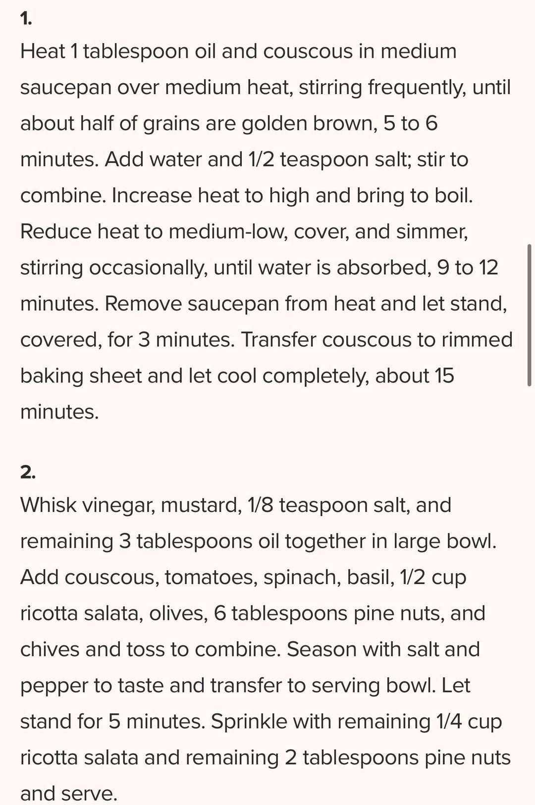 She toasts the maftoul in oil (I used EVOO) and then cooks it in a precise amount of water. Then cools it on a baking sheet. She developed. A variety of salads, but this one has spinach, basil, tomatoes, olives, and ricotta salata (I used feta). A lovely dish!