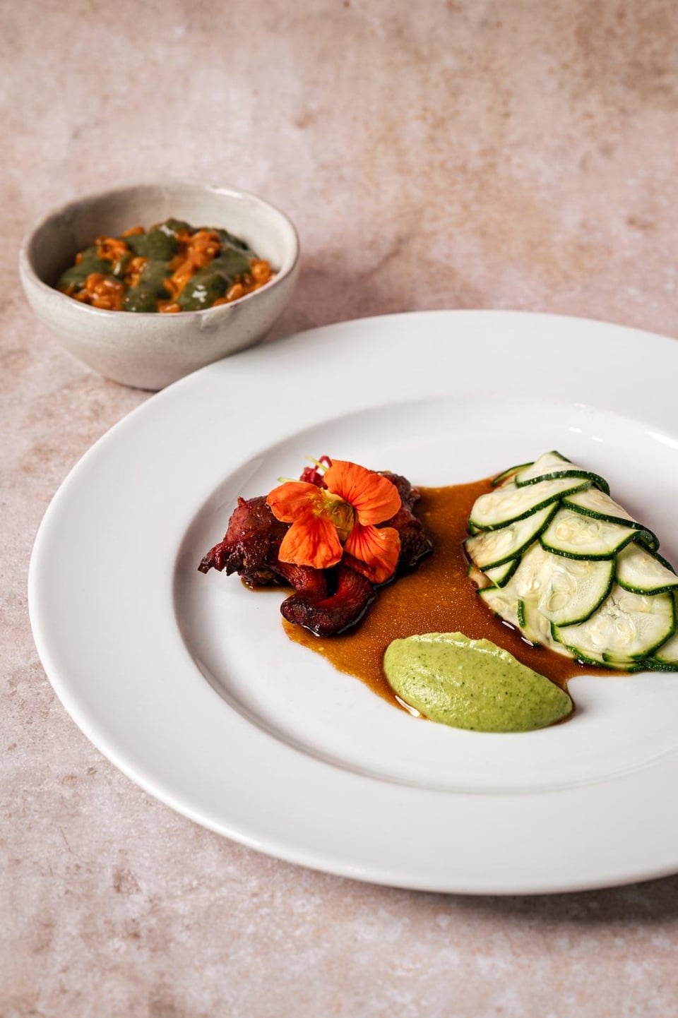 What I made: Courgette package, filled with fresh tofu and a duxelles of fennel, onion and courgette. A courgette creme. Mixed mushrooms, glazed with a reduction of soy whey, red beet and tomasu (dutch soy sauce). In the middle a vegetable reduction where I also used all the trimmings. On the side I had a bell pepper & spelt (local wheat) 'risotto' topped with a sauce made from burned spring onion and nasturtium.