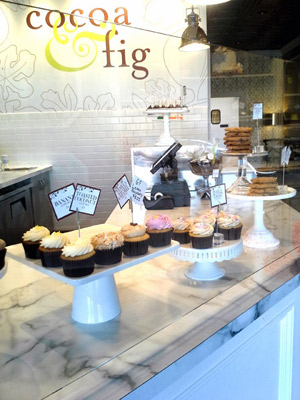 Twice the size of the tiny downtown space, the new Cocoa & Fig evokes an Anthropologie filled with edibles. It features a few marble-topped tables for dining in and a spacious counter and pastry case, as well as a separate room for wedding and event consultations. A shabby chic hutch displays housemade candies and granola for sale, and an artfully-weathered console table is topped by vintage cake stands.
