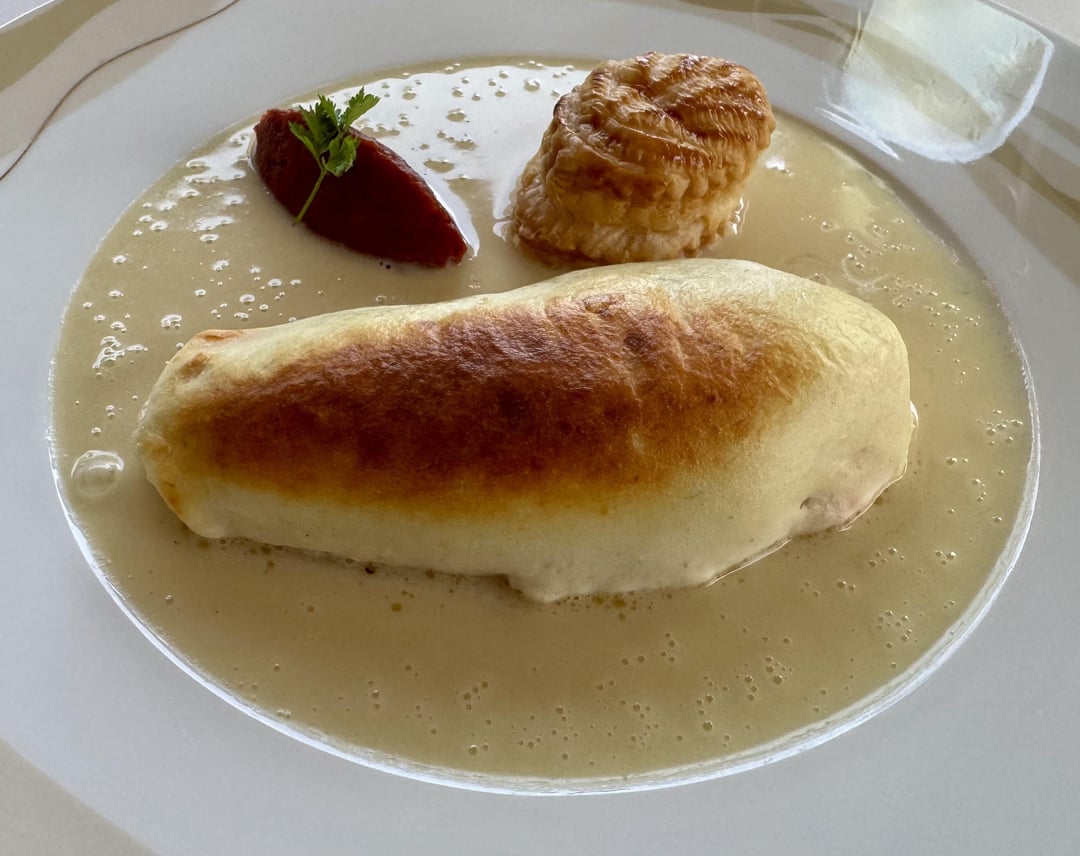 • Salmon soufflé with puff pastry and tomato concasse in a Riesling sauce