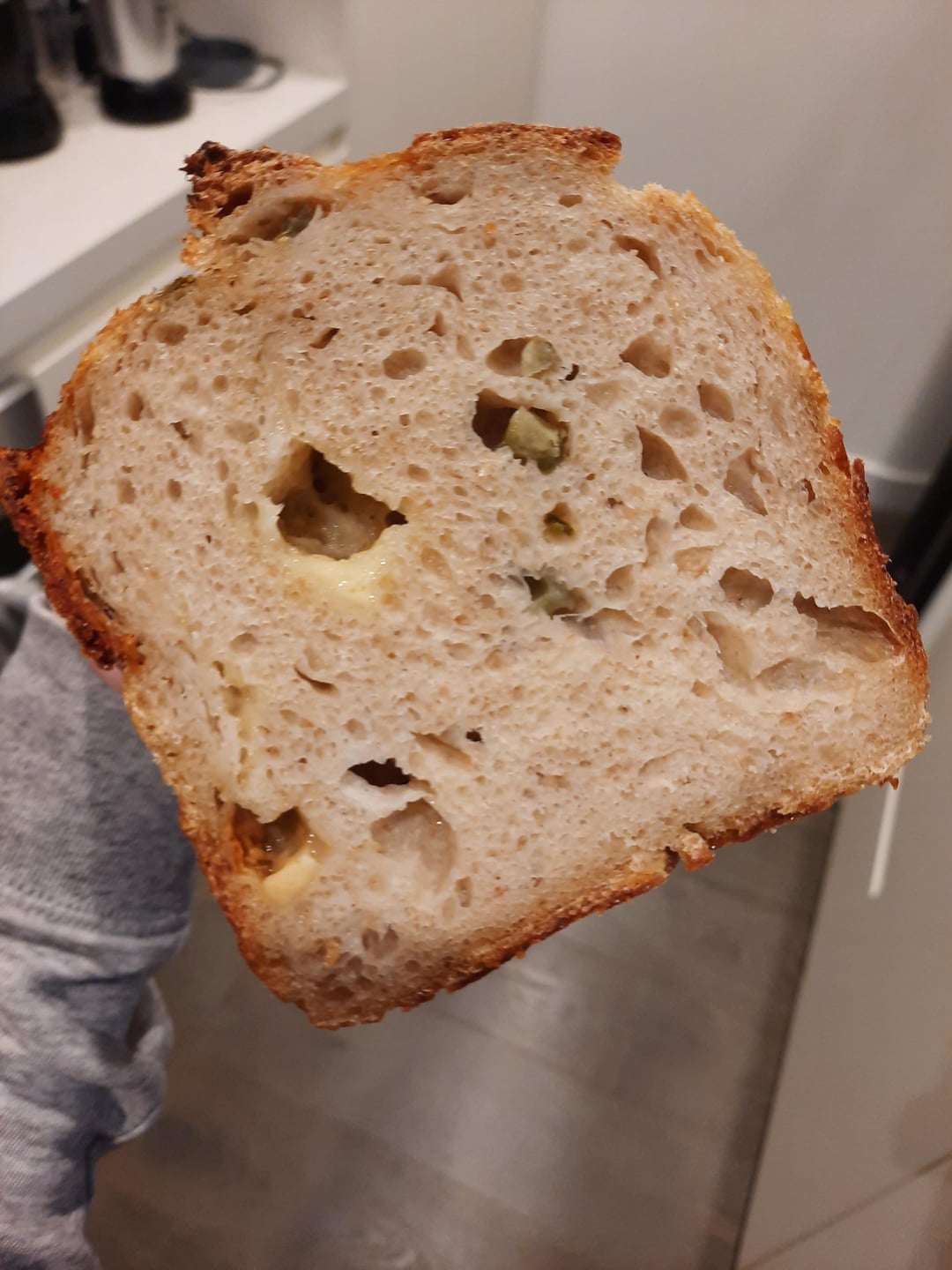 Bread is homemade jalapeno and cheese sourdough, 10% wholemeal. I usually make/eat higher percentage wholemeal or rye sourdough, but used more white flour as this bread contains inclusions (which weigh down the dough/impede gluten development).