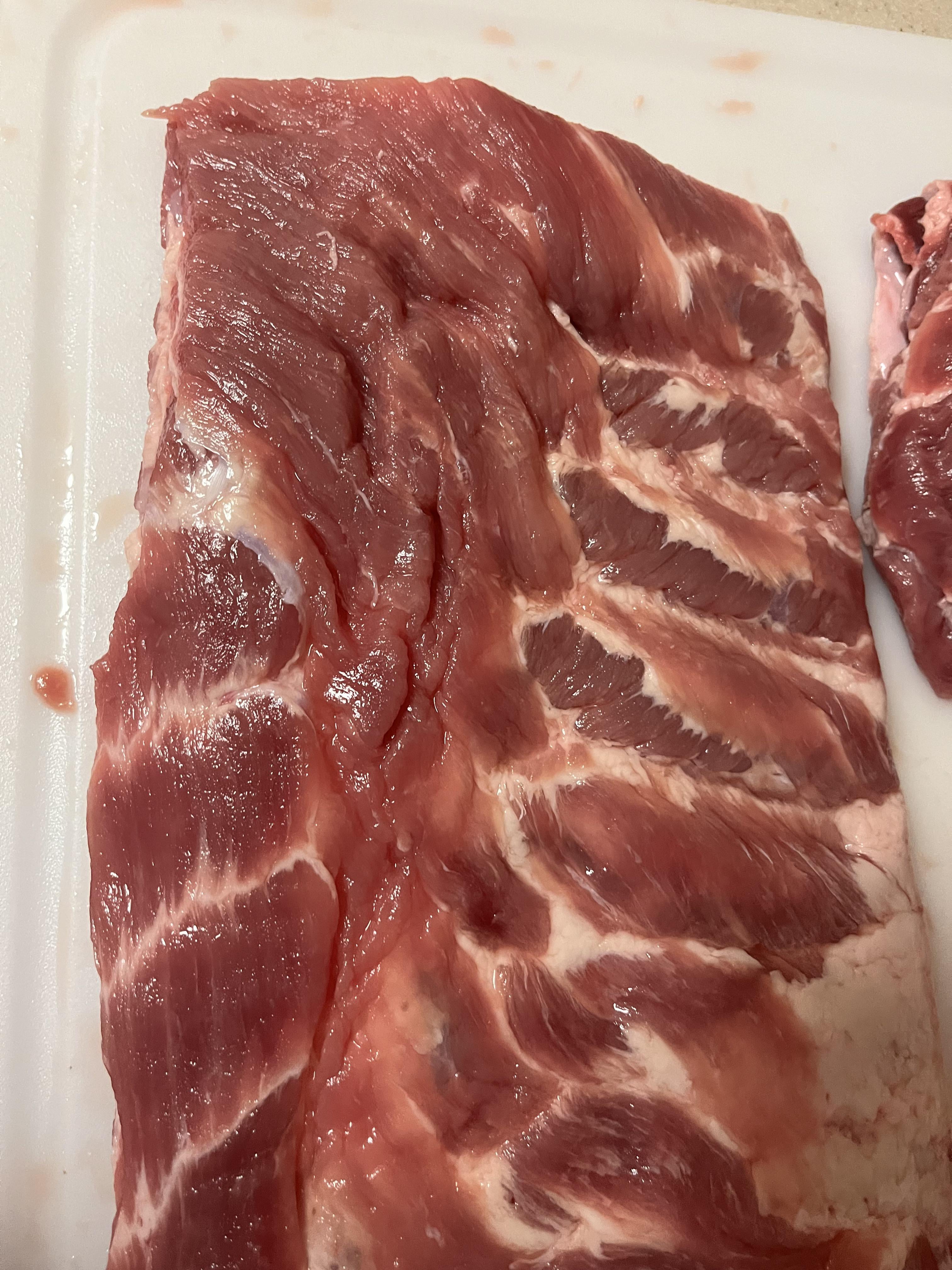 Each slab of ribs is only half the cut, cut perpendicular to the bones. Each of these looks different and has different meat to bone ratio. In Camada, we get both these cuts everywhere, but in the USA I think there may be some regional preference in some places for the cut nearer the back, and others the cut nearer the belly. I believe what you have there is the half nearer the back, which are meatier. Some butchers will trim off part of that area which doesn’t contain bone (but has some cartilages). Some call it rib tips. I like it attached as it is great meat. Some people cut it off and barbecue it apart from the bonier portion of the ribs.