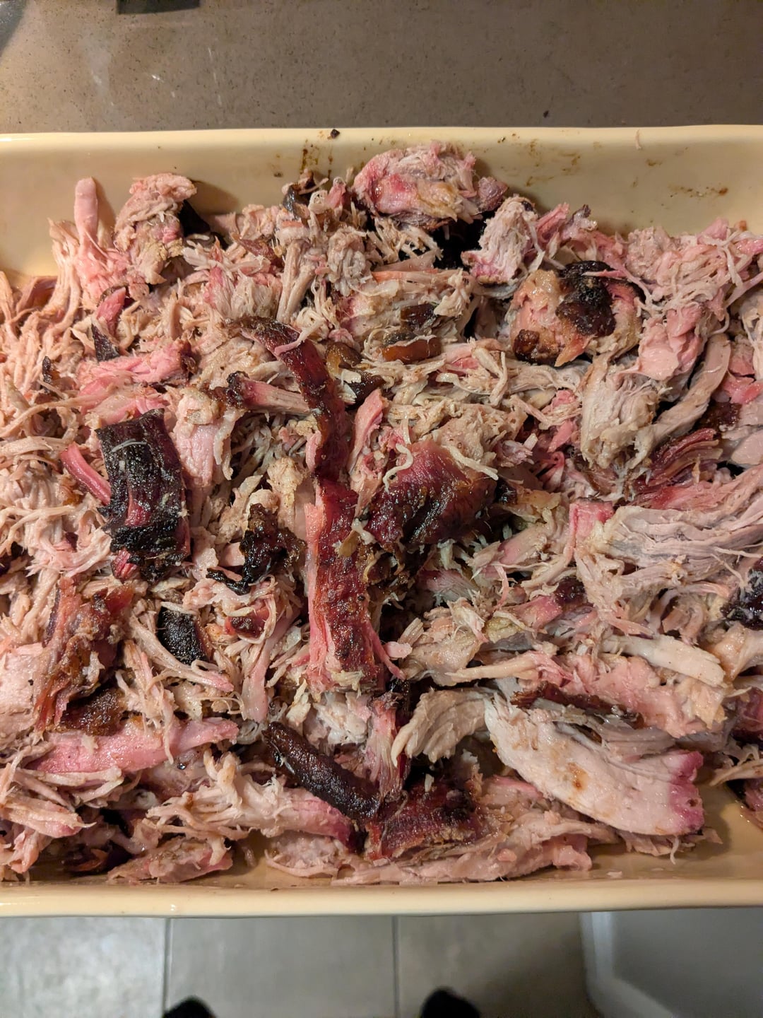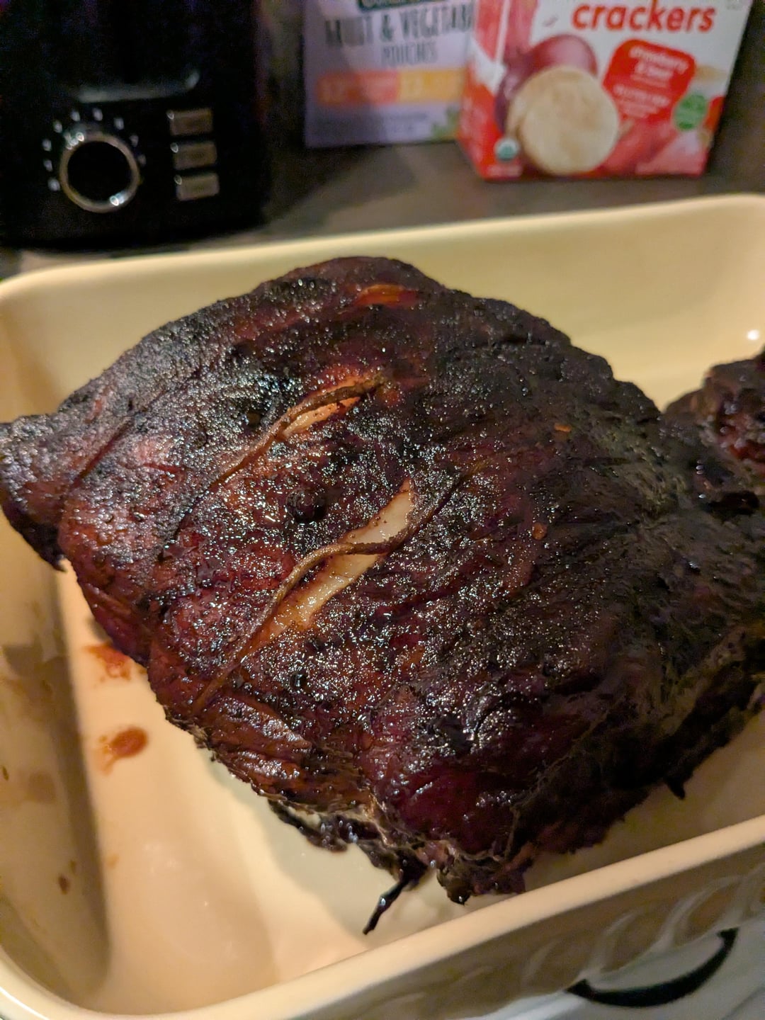 About 12 hours at temps between 215 and 265 (charcoal, so a challenge to keep just right) + 1hr of rest. by SRDCMarine 1 Comment wreckit_ron 4 months ago Looks good! Did you have to add more charcoal during the 12 hours of cooking?Write A CommentYou must be logged in to post a comment.