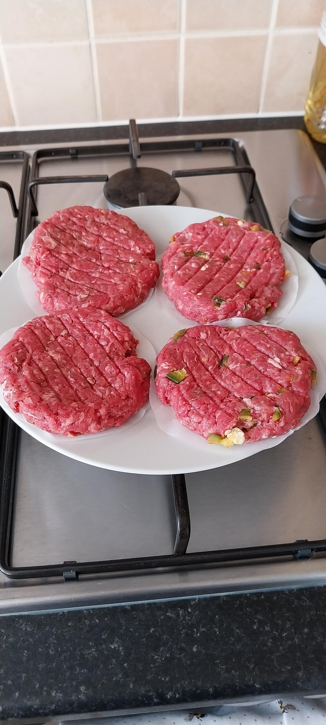 Homemade burgers, made with Salt, Pepper, Worcestershire sauce, Garlic powder and Onion powder. Made partner's with a chilli cut up and mixed in.