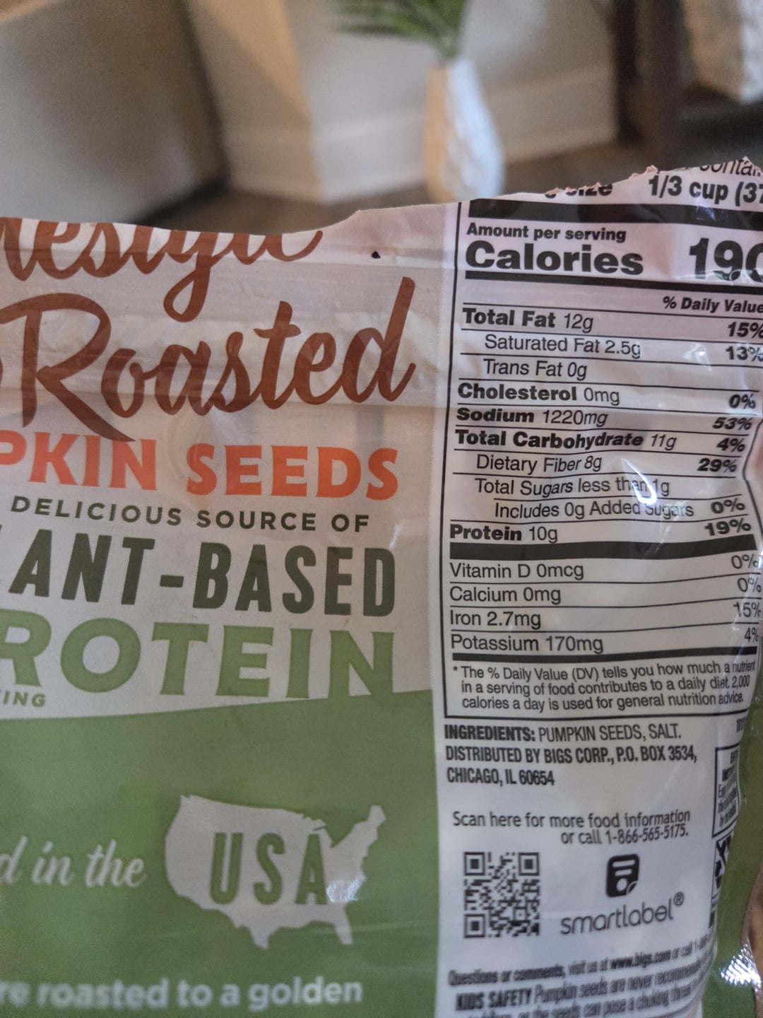 $2.50 for a nice 5 oz bag maybe 5 servings?Great macros and ZINC, etc. So satisfying. Idc about the sodium come on now by UnionOk360 3 Comments Safe-Pomegranate1171 8 months ago Just buy some raw unsalted pumpkin seeds aka pepitas. maxwellj99 8 months ago I got them recently and they are SOOO SALTY. Nice to see them in a gas station though. isthatsoreddit 8 months ago Bigs is the best brand, imoWrite A CommentYou must be logged in to post a comment.