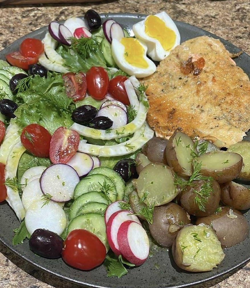 Spring mix greens with cucumber, radish, grape tomato, fennel, kalamata olives, fresh dill.