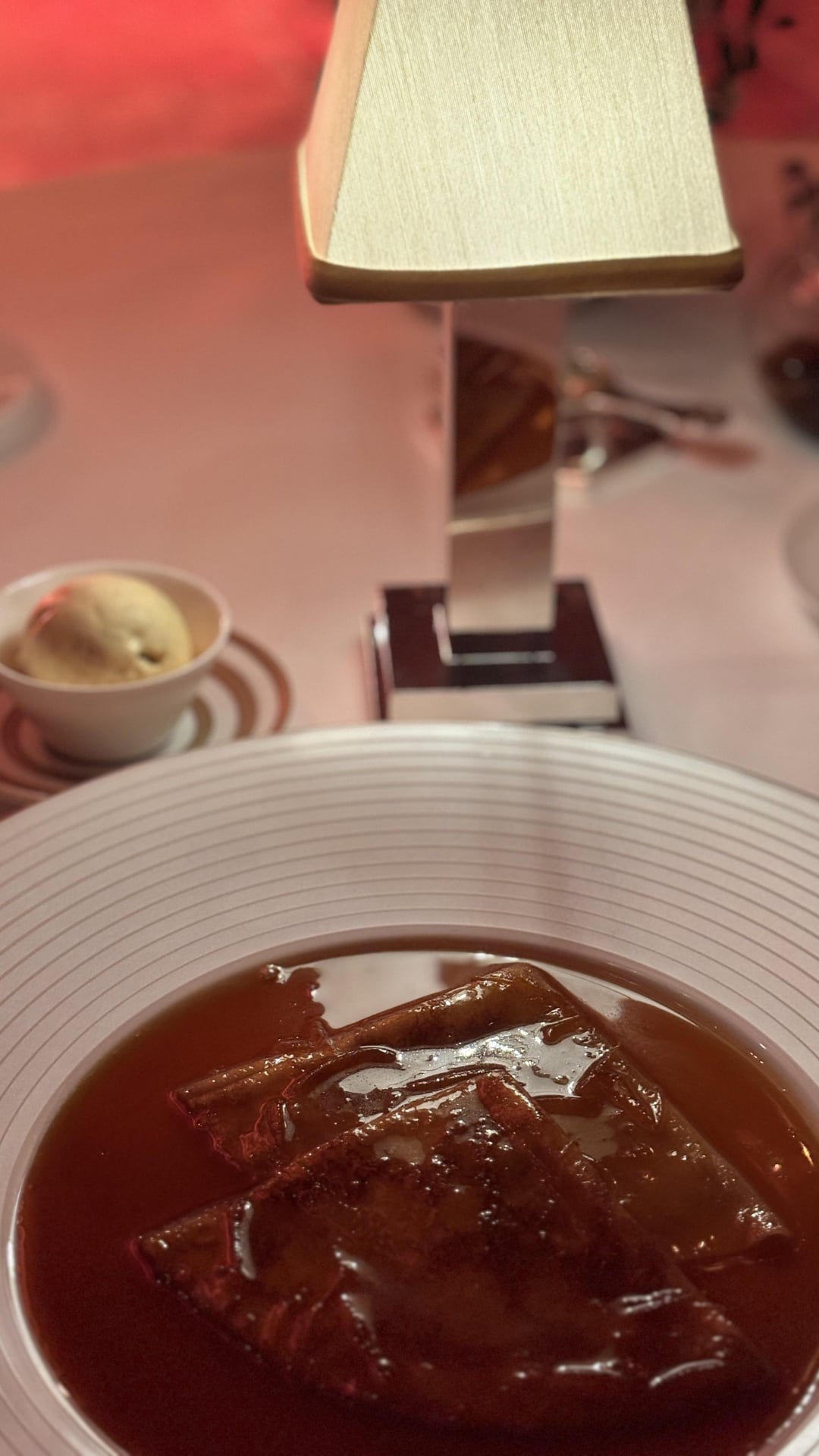 5) Pigeon à la Presse – rarely have I had moments where I’ve been spellbound. This was one. Just ethereal. The presentation including the table side Christofel Silver Presse with a stunning flambé and the breasts delicately carved by my trusty serveur Enzo. Oh Mon Dieu. The course itself. PERFECTION. Savoury, Gamey and Decadent Breasts of Pigeon cooked to perfection, melt in your mouth, scintillated by the rich, velevety and umami sauce with just the right sweetness from the remnants of the spirit, and some fresh pepperiness from the green peppercorns, and some crispy pommes soufflé to provide textural complexity and an occasional interlude from drowning in the decadence of the Pigeon. (I must confess, we’ve had this before, and we enjoy it so much that we learnt that for a £40pp supplement you can get a whole pigeon per person)
