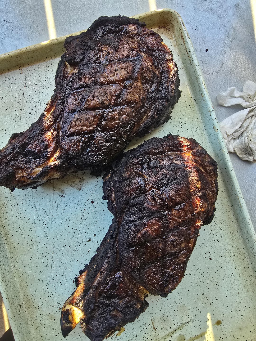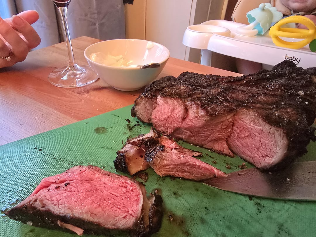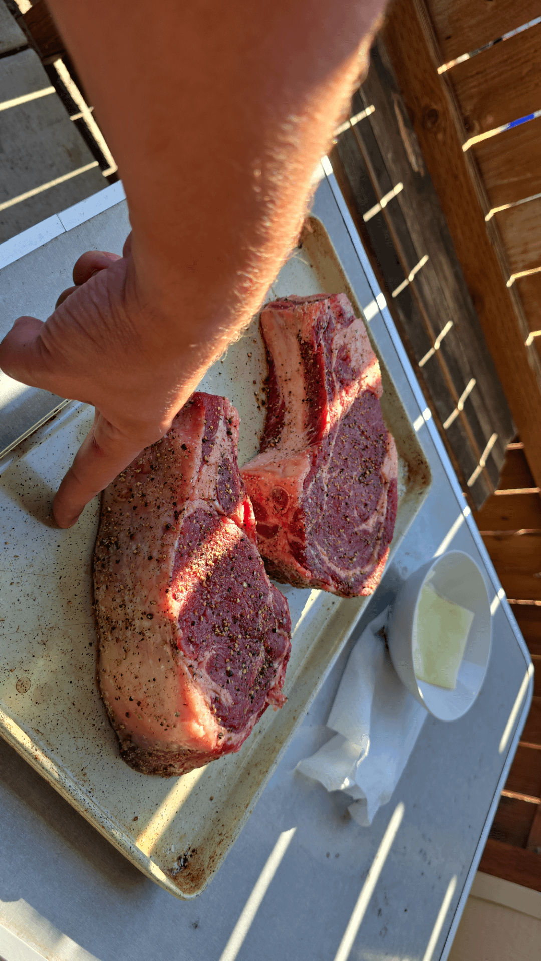 Had no idea she would get such INCREDIBLE peices of meat. Of course I think bone in ribeyes are the best steaks you can get. The ones she picked for me though were so gorgeous, I was a bit intimidated. So much fat makes for a great steak but also tough to grill perfectly. How did I do?