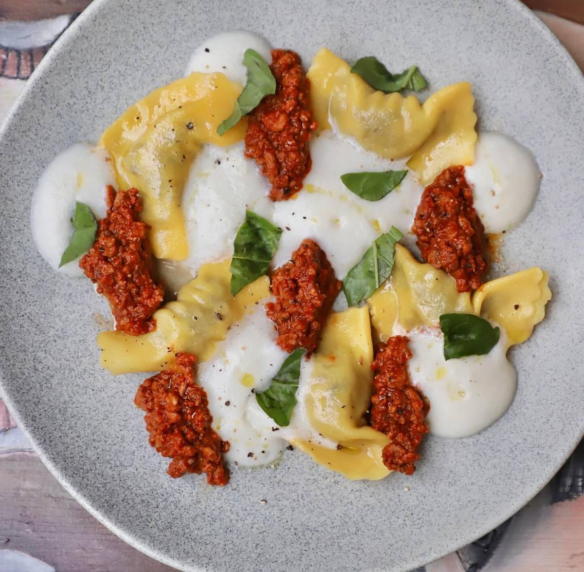 Homemade pastas like the cacio e pepe with shrimp tartar or the tortelli with homemade ragu (very deep flavor) and parmesan foam (looking for that elevation). Homemade bread that they use in their focaccia on the side or their brioche for the tartar. Or their fried bread for the panzanella, a salad with bread that here is elevated again with squid and shrimp.