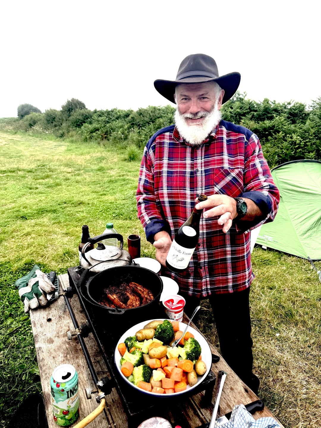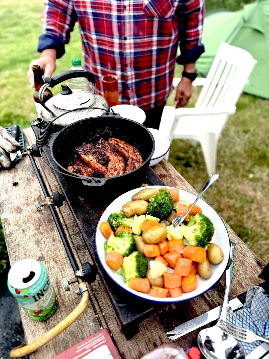 Used the recipe from Martha Rawlings Dutch oven cook book. Substituted belly pork for ribs. Cooked with fresh vegetables it was really good. Just right after a day outside by the sea. We had been fishing but failed miserably. This made a great substitute.