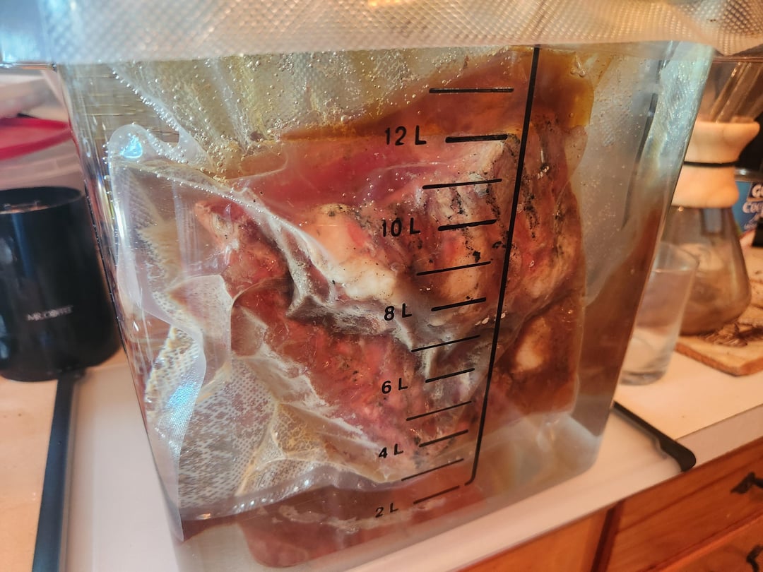 Brine for a couple days, smoked for a couple hours last night, now in the sous vide at 165. Results later!