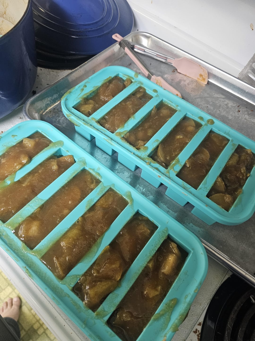 I made stewed fruit (apples and pears) from the trees in my yard in my half cup souper cubes. A dozen servings, ready to go. I cooked them down in my largest dutch oven with some sugar, molasses, cinnamon, nutmeg, and lemon juice.