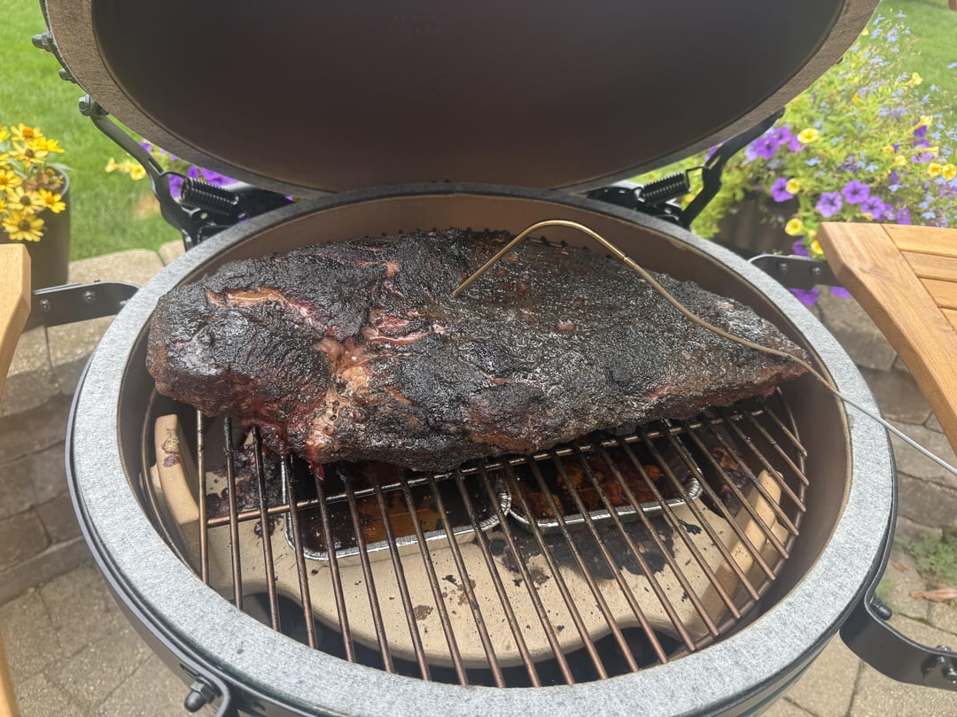 12 lbs beef brisket. Rubbed & refrigerated overnight. Egg to temp of 225. Hickory wood chips for added smoke. Pulled it when it reached internal temp of 170 (a call for work went long). Wrapped it in butcher paper for smoking, tossed it back in, & brought it up to internal temp of 200. Let it rest.